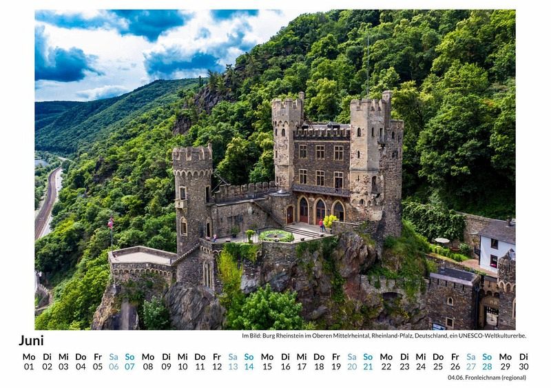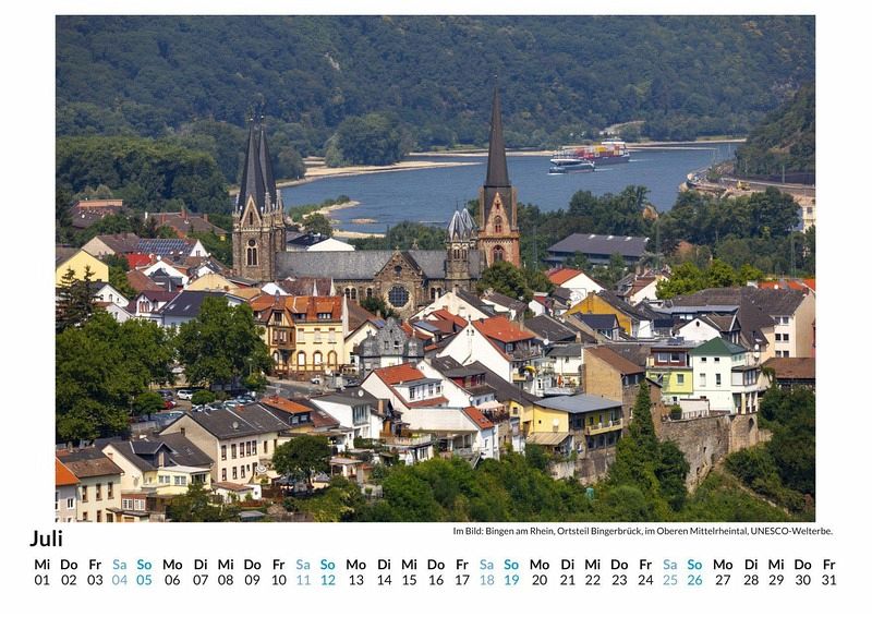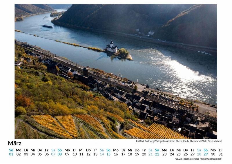 Entdecken Sie die atemberaubende Schönheit des Mittelrheintals mit unserem exklusiven Wandkalender! Lassen Sie sich Monat für Monat von 12 sorgfältig ausgewählten Motiven verzaubern, die die malerischen Landschaften, historischen Burgen und romantischen Weinberge dieser UNESCO-Welterbe-Region in Szene setzen. Gedruckt auf hochwertigem, lichtbeständigem Bilderdruckpapier, bringt dieser Kalender die Magie des Rheintals direkt in Ihr Zuhause. Nachhaltig in Deutschland auf FSC-zertifiziertem Papier produziert, vereint er höchste Qualität mit umweltbewusstem Design. Perfekt als Geschenk oder für die eigene Wand - holen Sie sich ein Stück Mittelrheintal in Ihr Leben! Hochwertig Erleben Sie ein Jahr voller Eleganz mit unserem Premium-Fotokalender. Jedes der 12 Motive ist auf hochwertigem, lichtbeständigem Bilderdruckpapier gedruckt, um die Lebendigkeit jedes Bildes zu bewahren. Die robuste Spiralbindung gewährleistet Langlebigkeit und einfache Handhabung. Nachhaltig Unser Engagement für die Umwelt spiegelt sich in jedem Exemplar wider. Durch die Produktion auf Abruf reduzieren wir signifikant unseren Abfall. Wir verwenden ausschließlich umweltfreundliches, FSC-zertifiziertes Papier. Stolz gefertigt in Deutschland, achten wir bei unserer Logistik auf Klimaschutz, um unseren ökologischen Fußabdruck zu minimieren. Das ideale Geschenk Dieser Kalender ist das perfekte Präsent für jeden Anlass - ob Weihnachten, Geburtstage oder einfach als liebevolle Aufmerksamkeit zwischendurch. Geeignet für Freunde, Familie, Kinder und Erwachsene gleichermaßen, bereichert er jedes Zuhause mit seiner Vielfalt und Schönheit, unabhängig vom Alter der Beschenkten.
