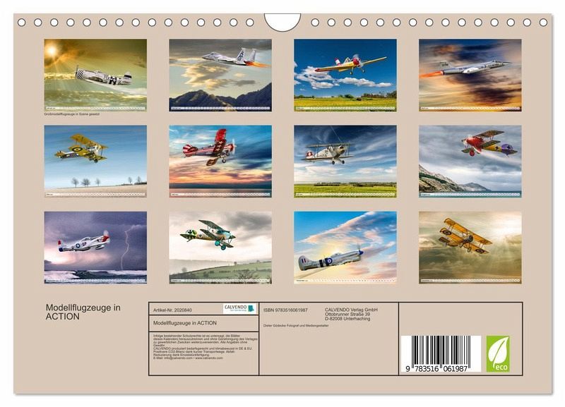 QUALITÄT - Hochwertiger Fotokalender mit 12 wunderschönen Motiven auf lichtbeständigem Bilderdruckpapier, robuste Spiralbindung mit Aufhängebügel.NACHHALTIG - deutliche Abfallreduzierung durch bedarfsgerechte Einzelstückfertigung, umweltfreundliches FSC-zertifiziertes Papier, Produktion in Deutschland, klimabewusste Logistik.PERFEKTES GESCHENK - Kalender für Freunde und Familie, für Kinder und Erwachsene, jung und alt, zu Weihnachten, Geburtstag oder zwischendurch.VIELFALT - Bildkalender in verschiedenen Formaten, z.B. DIN A5, DIN A4, DIN A3 sowie DIN A2. Ob Naturmotiv, Gemälde oder Fotos, ideal für ein persönliches Wohlfühlambiente.Modellflugzeuge in ihrem Element von Autor(in): Dieter Gödecke