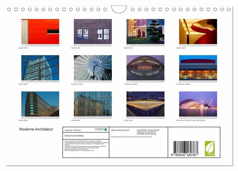 QUALITÄT - Hochwertiger Fotokalender mit 12 wunderschönen Motiven auf lichtbeständigem Bilderdruckpapier, robuste Spiralbindung mit Aufhängebügel.NACHHALTIG - deutliche Abfallreduzierung durch bedarfsgerechte Einzelstückfertigung, umweltfreundliches FSC-zertifiziertes Papier, Produktion in Deutschland, klimabewusste Logistik.PERFEKTES GESCHENK - Kalender für Freunde und Familie, für Kinder und Erwachsene, jung und alt, zu Weihnachten, Geburtstag oder zwischendurch.VIELFALT - Bildkalender in verschiedenen Formaten, z.B. DIN A5, DIN A4, DIN A3 sowie DIN A2. Ob Naturmotiv, Gemälde oder Fotos, ideal für ein persönliches Wohlfühlambiente.Moderne Architektur von Autor(in): Foto Concept