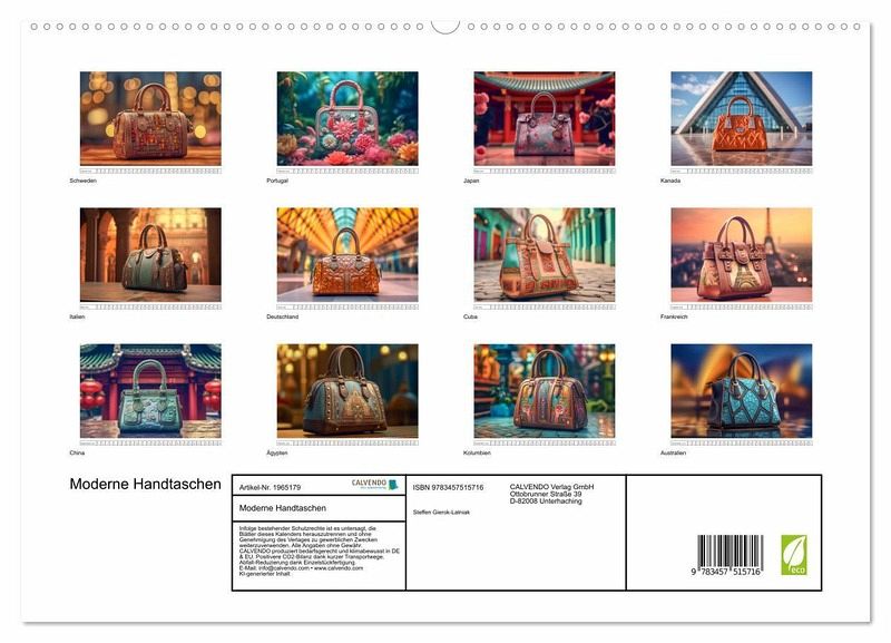 PREMIUM-LINIE - Brillanter Fotokalender mit 12 wunderschönen Motiven, Kunstdruck in Hochglanz in Museumsqualität.QUALITÄT - edle Materialien, stabile Rückwand mit 2 innovativen Einstecktaschen für eine optimale Präsentation an der Wand.NACHHALTIG - deutliche Abfallreduzierung durch bedarfsgerechte Einzelstückfertigung, umweltfreundliches FSC-zertifiziertes Papier, Produktion in Deutschland, klimabewusste Logistik.PERFEKTES GESCHENK - Kalender für Freunde und Familie, für Kinder und Erwachsene, jung und alt, zu Weihnachten, Geburtstag oder zwischendurch.Moderne Handtaschen sind mehr als nur praktische Accessoires zum Verstauen von persönlichen Gegenständen. Sie sind Ausdruck des individuellen Stils der Besitzerin. von Autor(in): Steffen Gierok ; Magik Artist Design