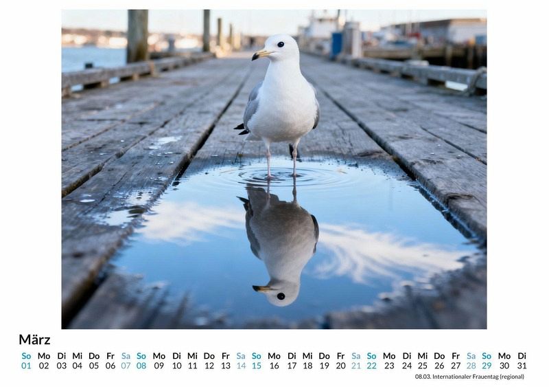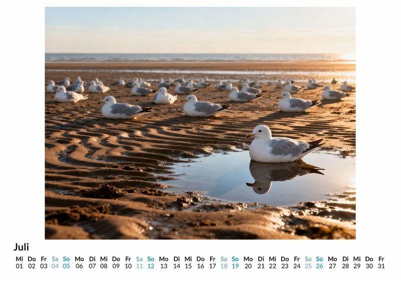 Das Rauschen der Wellen, der salzige Geruch der Luft und der charakteristische Ruf, der unverkennbar zur Küste gehört. Die Möwe ist mehr als nur ein Vogel, sie ist ein lebendiges Symbol für Freiheit, Meer und die unendliche Weite des Horizonts. Dieser Kalender ist ideal geeignet: * Für alle, die das maritime Flair lieben und sich ein Stück Küste nach Hause holen möchten. * Für Betrachter, die die Eleganz und den Charakter von Möwen in verschiedenen Facetten entdecken wollen. * Für jene, die eine besondere Art der Fotokunst schätzen, die vertraute Motive neu interpretiert. Der Kalender "Möwe" widmet sich diesem ikonischen Vogel in zwölf einzigartigen Darstellungen. Jedes Monatsblatt zeigt eine andere Perspektive auf das Symbol der Küste, von der majestätischen Pose im Flug bis zum wachsamen Blick am Hafen. Die Bilder sind eine Komposition aus Daten und kreativer Berechnung, die eine besondere visuelle Tiefe erzeugen und den Vogel in einem neuen Licht erscheinen lassen. Sie fangen die typische Atmosphäre ein, die diese Tiere umgibt, und präsentieren sie in einer ruhigen und fokussierten Weise. Beim Kauf dieses Kalenders kann man Folgendes erwarten: * Zwölf Monatsblätter, die die Möwe in verschiedenen Stimmungen und Umgebungen zeigen. * Ein übersichtliches Kalendarium, das Platz für Termine und Notizen lässt. * Ein Wandkalender, der das ganze Jahr über eine maritime Atmosphäre schafft. Dieser Kalender ist eine Hommage an einen der bekanntesten Bewohner der Küstenregionen und fängt die Essenz des maritimen Lebens ein. Er begleitet durch das Jahr und lädt dazu ein, die vielen Gesichter dieses faszinierenden Vogels zu erkunden. Es lohnt sich, die einzelnen Monatsansichten zu entdecken.