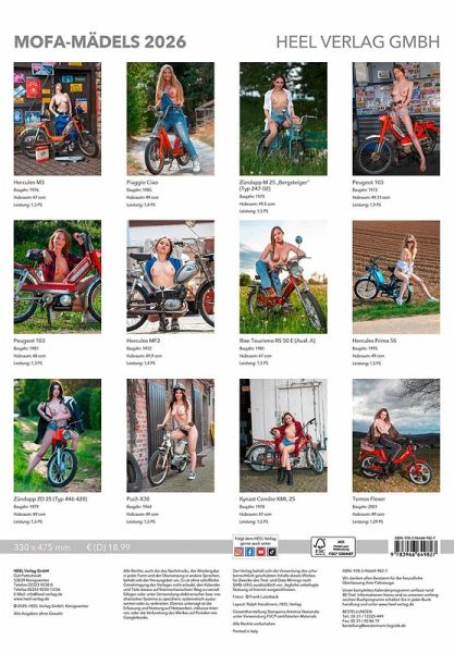 Zweiradnostalgie von ihrer erotischen Seite - ein Must-Have und das perfekte Geschenk für Mofa-Fans! 2026 wird ein tolles Jahr für Mofa-Fahrer: Der Kalender zeigt zwölf attraktive Models, sexy und verführerisch in Szene gesetzt mit top restaurierten, nostalgischen Mofa-Modellen von Hercules und Zündapp über Piaggio bis Peugeot, bis hin zu seltenen Schätzchen von Rixe, Puch, Kynast und Tomos.-Hochwertige Ausstattung: 14 Seiten Kunstdruckpapier, 330 x 475 mm, Cover mit Glanzlack veredelt, stabile Rückwand, silberne Spiralbindung, mit großem Wandplaner als Jahresübersicht, in Europa produziert, der Umwelt zuliebe ist unser Papier FSC-zertifiziert. Diese ästhetischen Erotik-Fotografie-Kalender 2026 vom Fotograf Frank Lutzebäck gibt es im HEEL-Verlag: Jungbauernträume, Schwalbenmächen, Mofa-Mädels, Schrauberträume. Weiterer erotischer Kalender: Men in Kilts.
