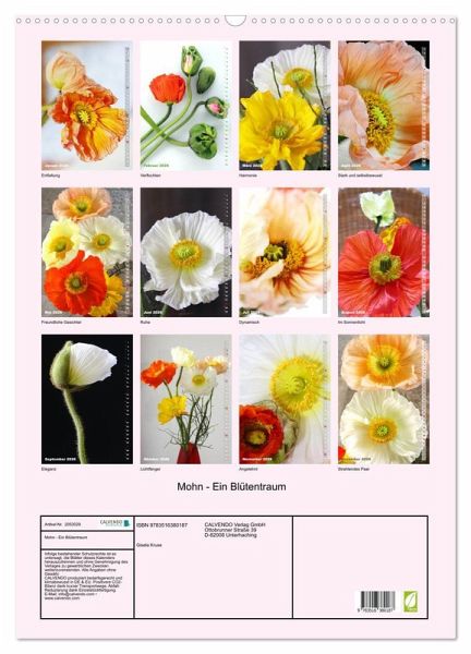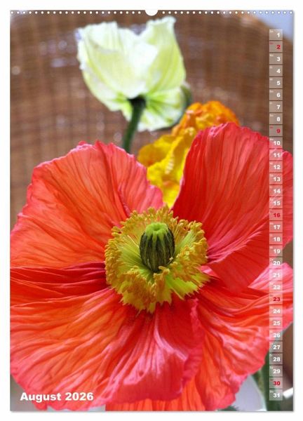 Der kräftige Islandmohn in diesem Kalender fasziniert genauso wie der zarte und filigrane Wiesen- oder Klatschmohn. Das Sprengen der Mohnkapsel und die Entfaltung der Blüte ist ein immer wieder reizvolles Schauspiel, das sich wunderbar bei frischem Mohn in der Vase beobachten lässt. Und, dieser fantasievolle Kalender lässt die vergänglichen Schönheiten für immer blühen. Dieser qualitativ hochwertige