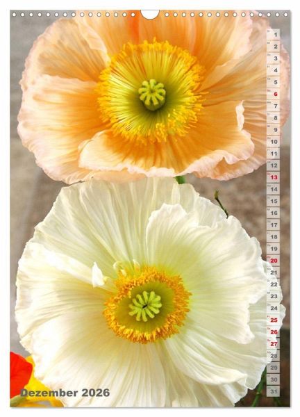 Der kräftige Islandmohn in diesem Kalender fasziniert genauso wie der zarte und filigrane Wiesen- oder Klatschmohn. Das Sprengen der Mohnkapsel und die Entfaltung der Blüte ist ein immer wieder reizvolles Schauspiel, das sich wunderbar bei frischem Mohn in der Vase beobachten lässt. Und, dieser fantasievolle Kalender lässt die vergänglichen Schönheiten für immer blühen. Dieser qualitativ hochwertige
