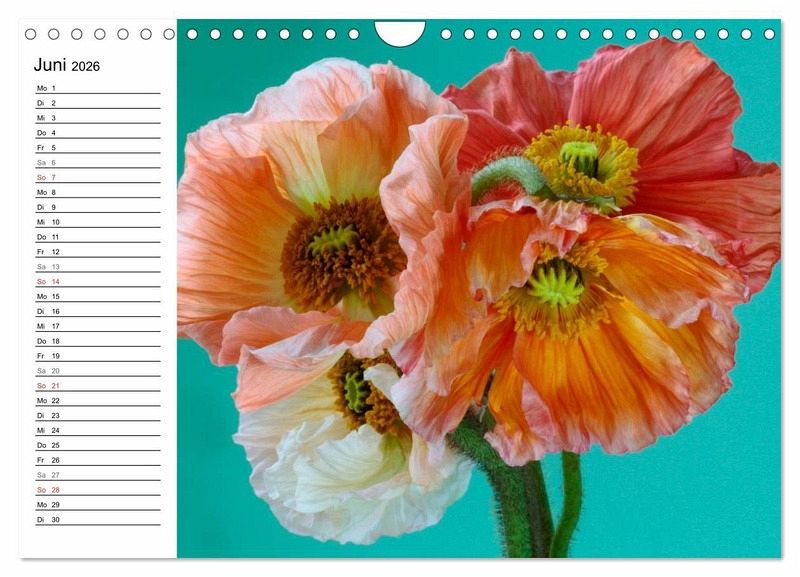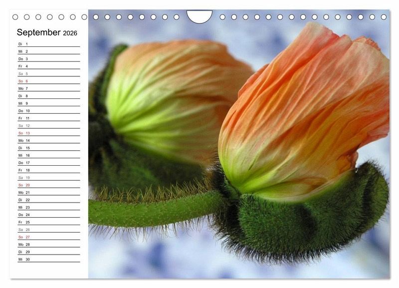 Nicht nur der zarte Wiesenmohn begeistert die Menschen, sondern ebenso die etwas robusteren Zuchtsorten mit ihren dickeren Stängeln und größeren Blüten. Immer wieder ist die Entfaltung der Blüte und das Sprengen der Mohnkapsel ein faszinierendes Vergnügen, bis sich die gefältelte Blüte endlich in ganzer Pracht zeigt. Genießen Sie die verschiedenen Stadien der Mohnblüte in diesem besonderen Kalender.