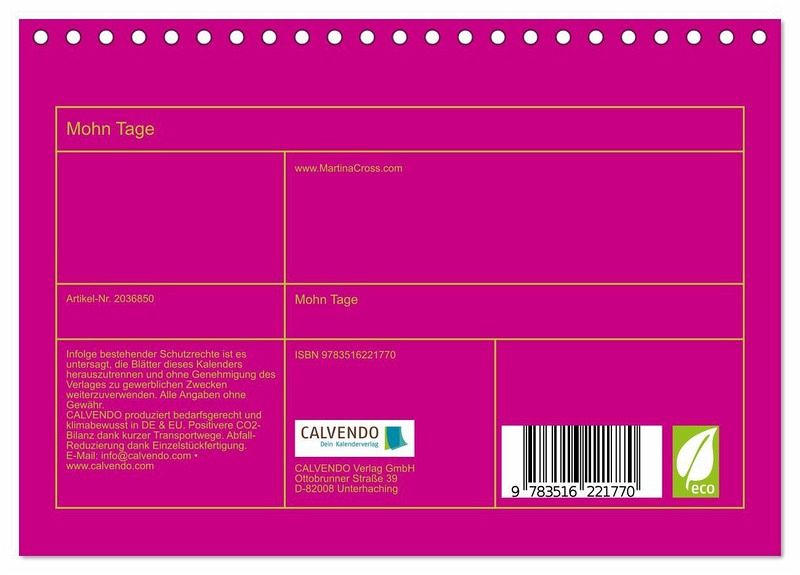 QUALITÄT - Hochwertiger Fotokalender mit 12 wunderschönen Motiven auf lichtbeständigem Bilderdruckpapier, robuste Spiralbindung.NACHHALTIG - deutliche Abfallreduzierung durch bedarfsgerechte Einzelstückfertigung, umweltfreundliches FSC-zertifiziertes Papier, Produktion in Deutschland, klimabewusste Logistik.PERFEKTES GESCHENK - Kalender für Freunde und Familie, für Kinder und Erwachsene, jung und alt, zu Weihnachten, Geburtstag oder zwischendurch.VIELFALT - Bildkalender in verschiedenen Formaten, z.B. DIN A5, DIN A4, DIN A3 sowie DIN A2. Ob Naturmotiv, Gemälde oder Fotos, ideal für ein persönliches Wohlfühlambiente.Mohn in seiner schönsten Form - Geniessen Sie 12 wunderbare Mohn Portraits von Autor(in): Martina Cross