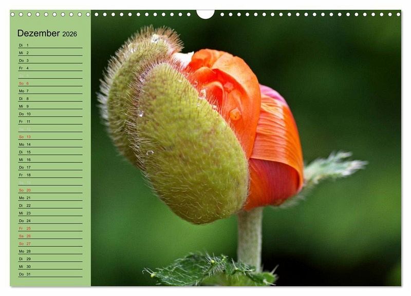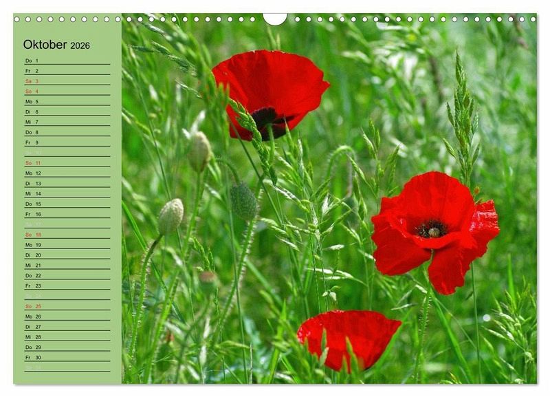 Faszinierend ist die Mohnblüte mit ihrem rot das die Kornfelder zum leuchten bringt. Hier finden sie Mohnblüten Impressionen ob einzeln oder im Feld als Blumen Gruppe. Dieser Kalender lässt die Sehnsucht nach dem Sommer aufleben.
