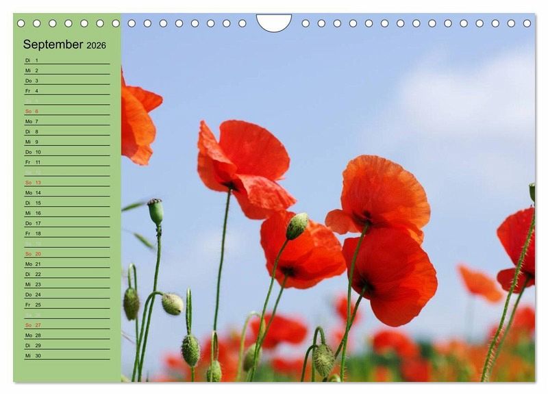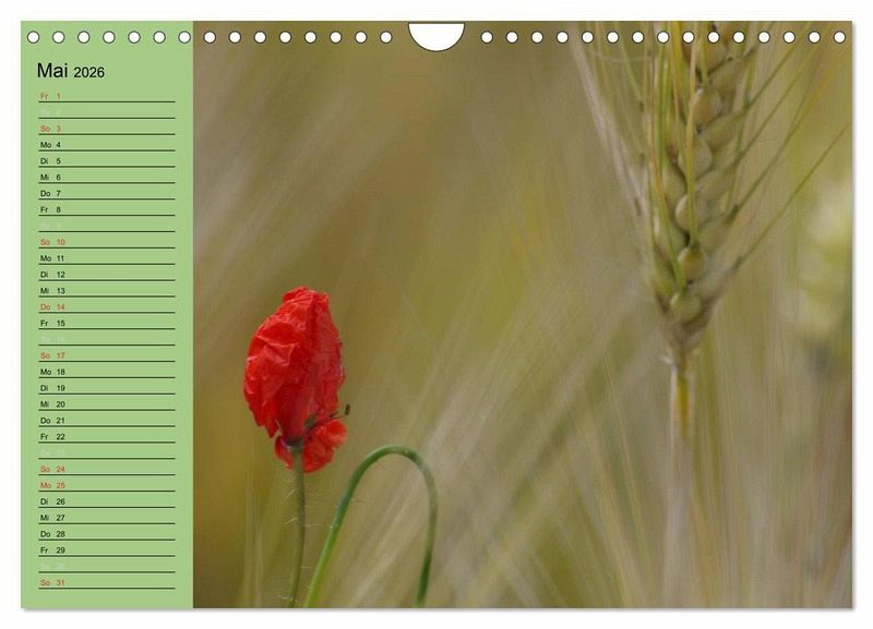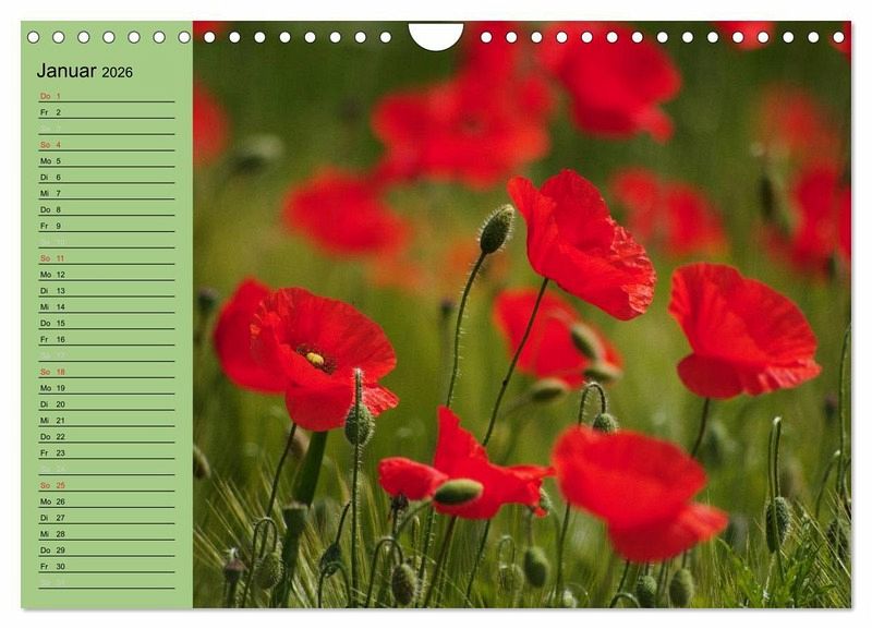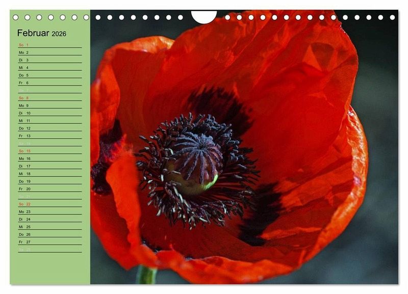 Faszinierend ist die Mohnblüte mit ihrem rot das die Kornfelder zum leuchten bringt. Hier finden sie Mohnblüten Impressionen ob einzeln oder im Feld als Blumen Gruppe. Dieser Kalender lässt die Sehnsucht nach dem Sommer aufleben.