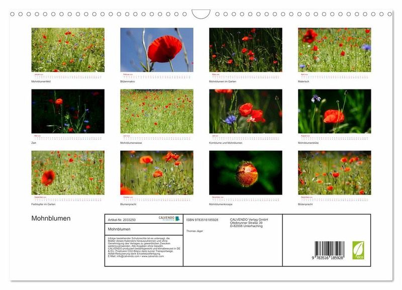 QUALITÄT - Hochwertiger Fotokalender mit 12 wunderschönen Motiven auf lichtbeständigem Bilderdruckpapier, robuste Spiralbindung mit Aufhängebügel.NACHHALTIG - deutliche Abfallreduzierung durch bedarfsgerechte Einzelstückfertigung, umweltfreundliches FSC-zertifiziertes Papier, Produktion in Deutschland, klimabewusste Logistik.PERFEKTES GESCHENK - Kalender für Freunde und Familie, für Kinder und Erwachsene, jung und alt, zu Weihnachten, Geburtstag oder zwischendurch.VIELFALT - Bildkalender in verschiedenen Formaten, z.B. DIN A5, DIN A4, DIN A3 sowie DIN A2. Ob Naturmotiv, Gemälde oder Fotos, ideal für ein persönliches Wohlfühlambiente.Schöne Fotografien von Mohnblumen von Autor(in): Anette Jäger