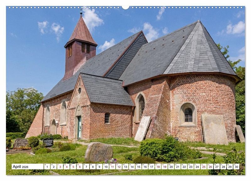 April: Die romanische Kirche Sankt Martin in Osterhever wurde auf einer Warft errichtet und galt auch als Zufluchtsort bei schweren Sturmfluten