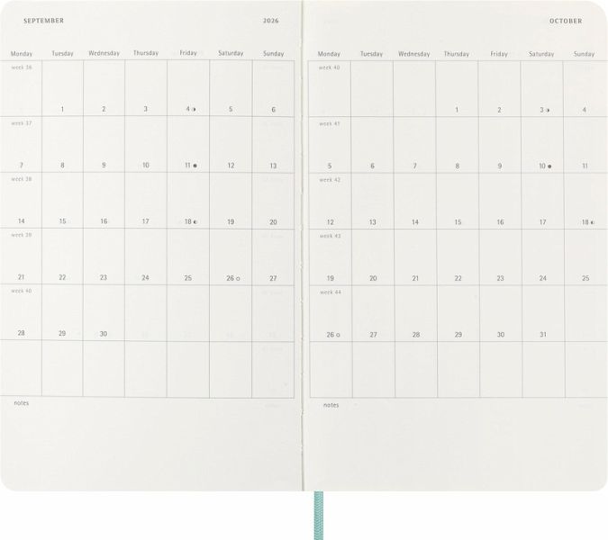 Liebe zum Detail, Design und Handwerkskunst vereinen sich in diesen luxuriösen Kalendern, die in Zusammenarbeit mit Vegea, einem Pionierunternehmen, das organische Abfälle aus der der italienischen Weinindustrie in biobasierte Materialien umwandelt. Der glatte vegane Umschlag kommt direkt vom Weinberg zum Kalender. - datiert von Januar bis Dezember 2026 - veganer weicher Einband - abgerundete Ecken, elastischer Verschluss und passendes Lesebändchen Lesezeichen - elfenbeinfarbenes, 100 g/m², säurefreies Papier - In case of loss" auf dem Vorsatzblatt aufgedruckt - erweiterbare Innentasche auf der Rückseite - liegt flach, öffnet sich um 180° - die Geschichte von Moleskine ist drin - das Papier dieses Moleskine-Objekts ist aus Material hergestellt aus gut bewirtschafteten, FSC® -zertifizierten Wäldern und anderen kontrollierten Quellen - wiederverwendbare Geschenkbox
