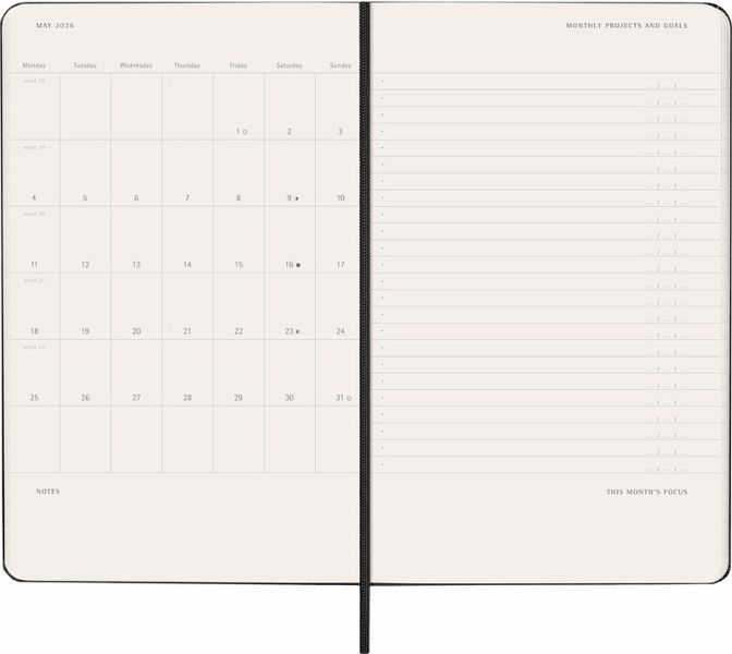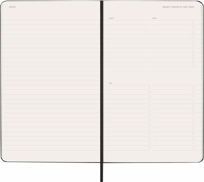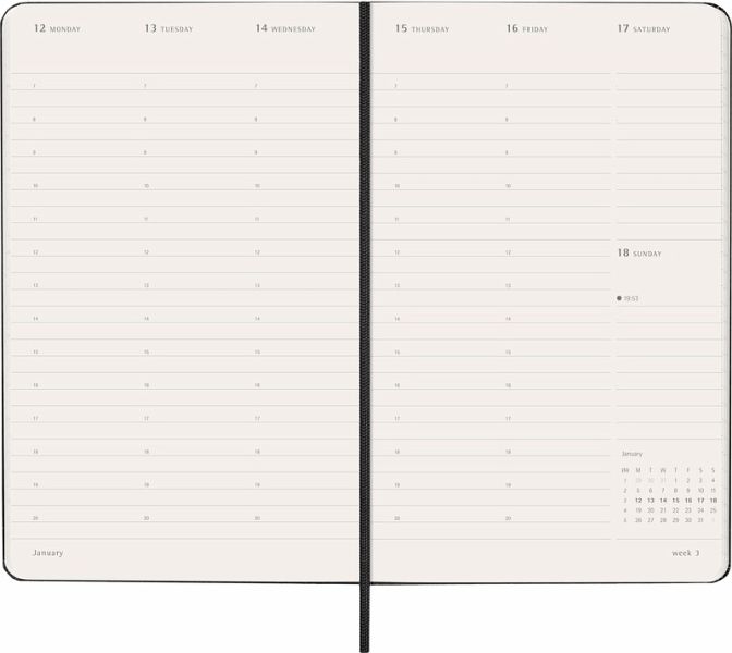 Mit dem vertikalen 12-Monats-Wochenkalender PRO kehrt Ordnung ein. Er ist von Januar bis Dezember datiert und zeigt die Woche über 2 Seiten jeweils mit Platz für Projektplanung, Notizen und Aufgaben. Mit Seiten für Ihre Jahresziele sowie Monats- und Wochenprojekte und mit heraustrennbaren Seiten und To-Do-Listen behalten Sie Ihr Arbeitspensum im Blick. - datiert von Januar bis Dezember 2026 - Hardcover, abgerundete Ecken, elastischer Verschluss und passendes Lesezeichen mit Band - doppelte Innentasche aus Karton und Stoff - elfenbeinfarbenes, 70 g/m² schweres, säurefreies Papier - heraustrennbare Seiten und heraustrennbare To-Do-Listen - monatliche und wöchentliche Projekte und Aufgaben - Jahresziele und wöchentliche Inhaltsseite - stündliche Aufschlüsselung für jeden Tag - Hinweis "Bei Verlust" auf dem Vorsatzblatt - liegt flach, lässt sich um 180° öffnen - Jahreszahl auf dem vorderen Einband eingeprägt