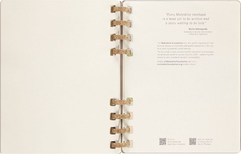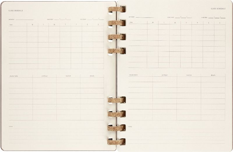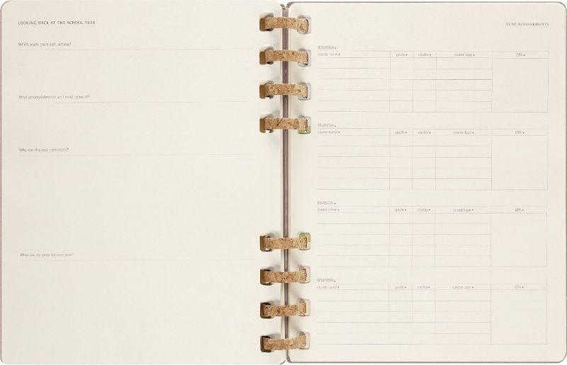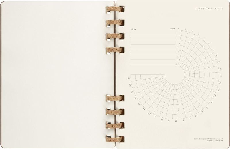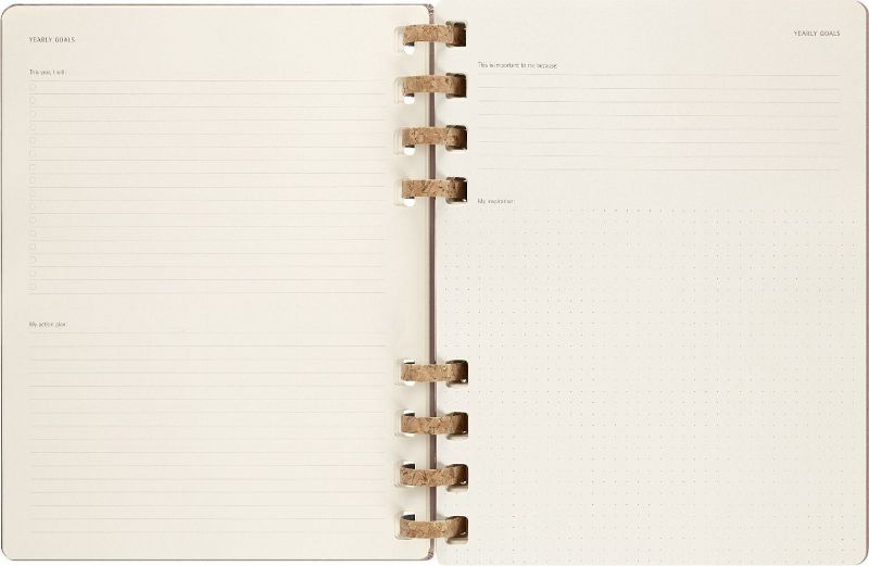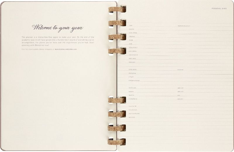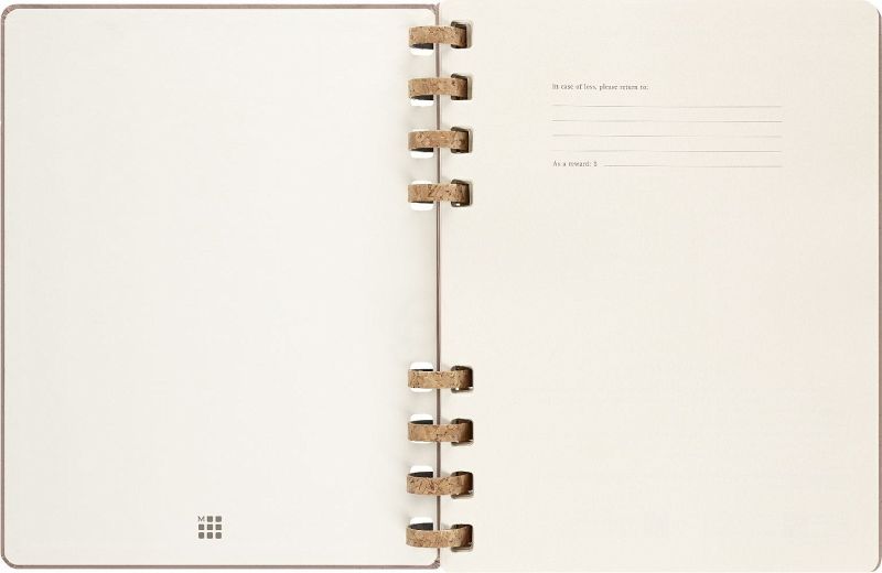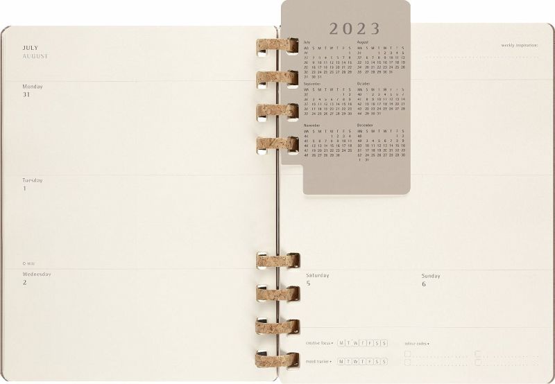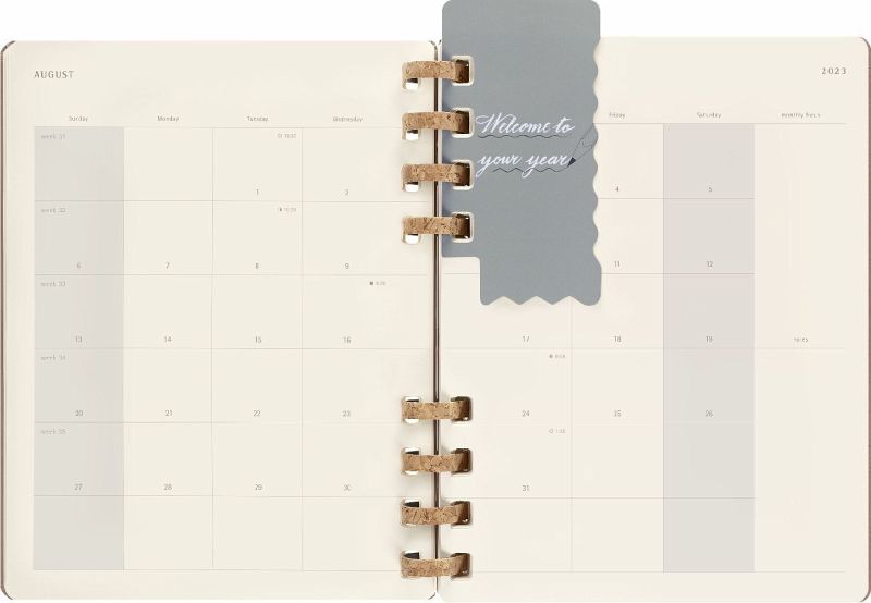 Eigenschaften - fester Einband, abgerundete Ecken, Gummiband zum Verschließen und interne Falttasche - robuste, aber flexible Spiralbindung aus Kork-Mix - Vorsatzblatt mit in case of loss Label - datiert von Juli 2023 bis Juni 2024 - elfenbeinweißes Papier, 100 g/m², säurefrei - Jahreszahl mit Goldfolienprägung auf dem vorderen Einband Layout Wochen-Monatskalender Formate Large 13 × 21 cm - 5 × 8 X-Large 19 × 25 cm - 7 × 9 Einlagen - Sticker - 3 laminierte Lesezeichen