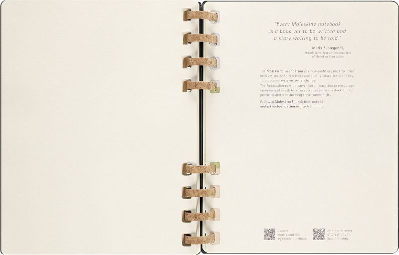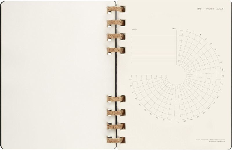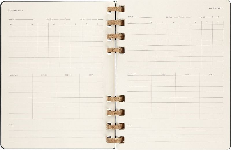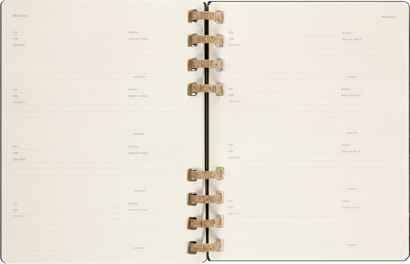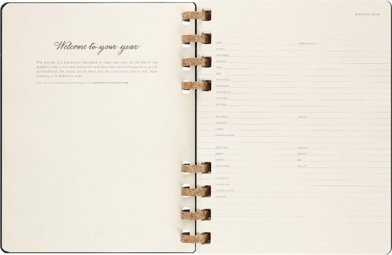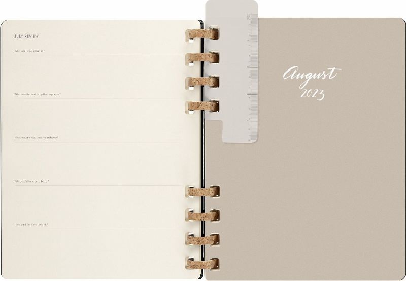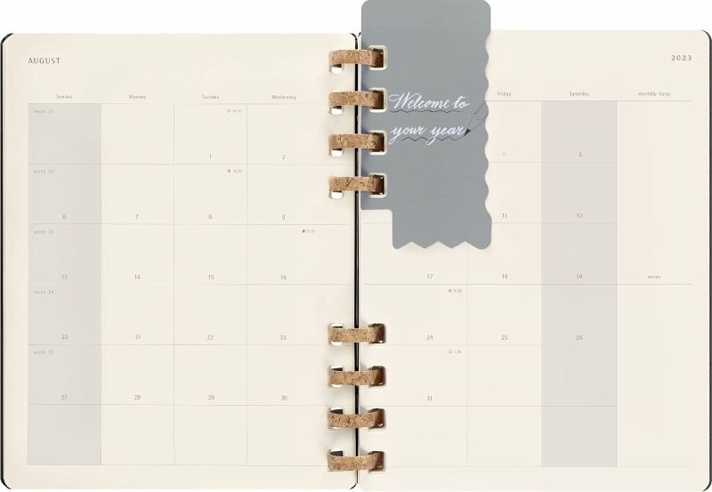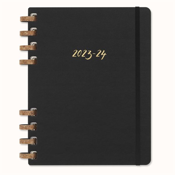Eigenschaften - fester Einband, abgerundete Ecken, Gummiband zum Verschließen und interne Falttasche - robuste, aber flexible Spiralbindung aus Kork-Mix - Vorsatzblatt mit in case of loss Label - datiert von Juli 2023 bis Juni 2024 - elfenbeinweißes Papier, 100 g/m², säurefrei - Jahreszahl mit Goldfolienprägung auf dem vorderen Einband Layout Wochen-Monatskalender Formate Large 13 × 21 cm - 5 × 8 X-Large 19 × 25 cm - 7 × 9 Einlagen - Sticker - 3 laminierte Lesezeichen