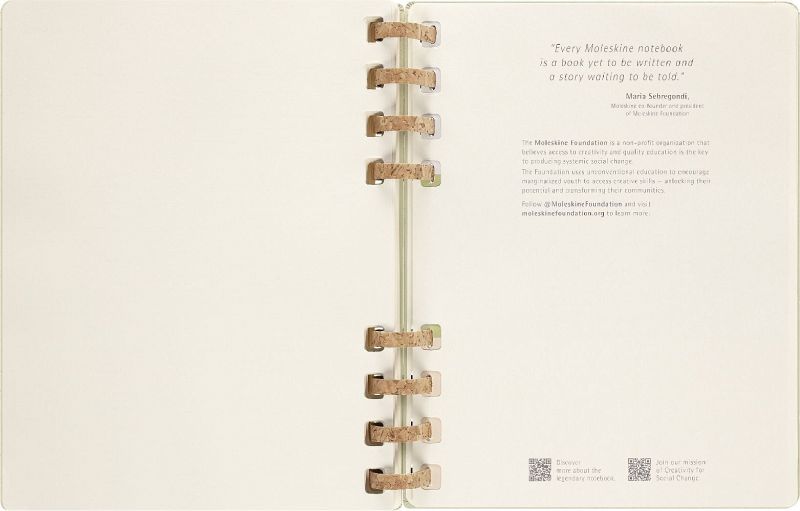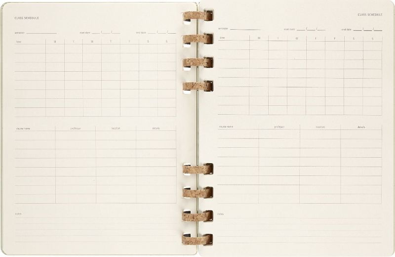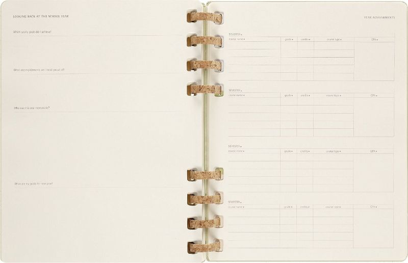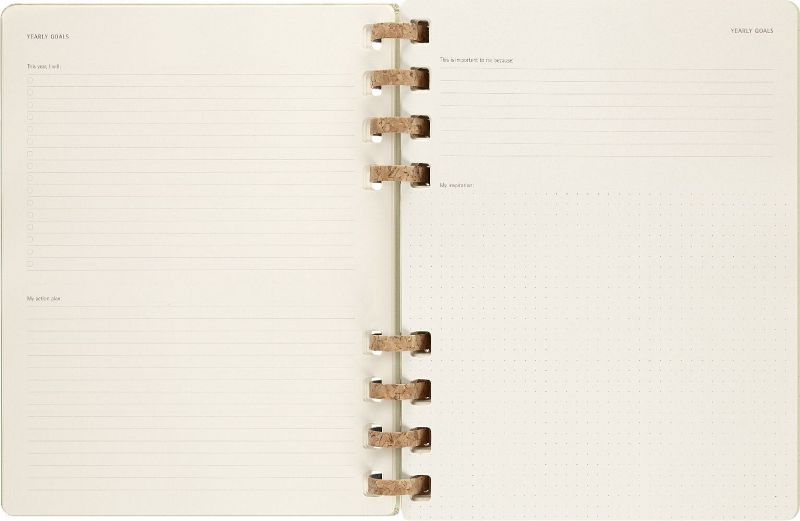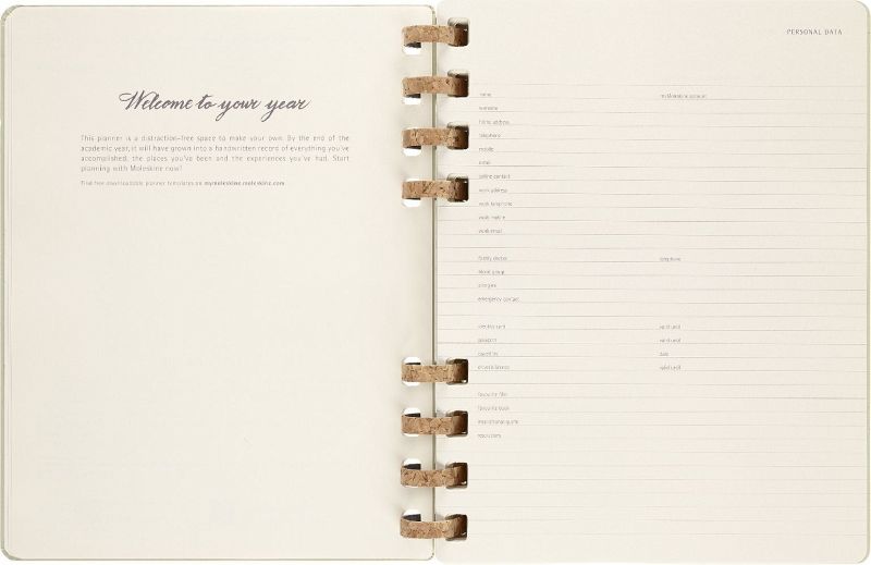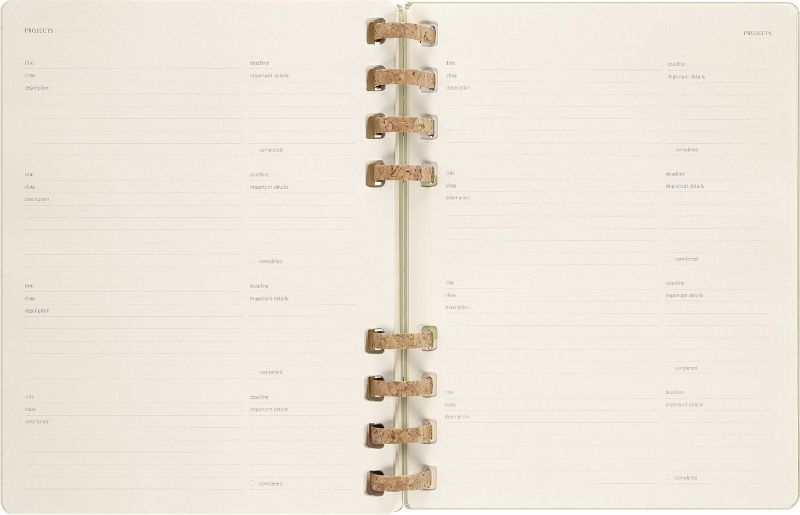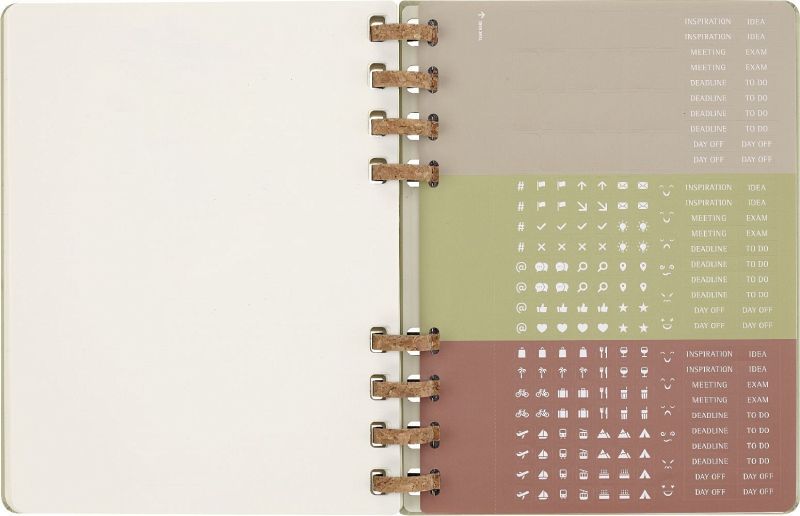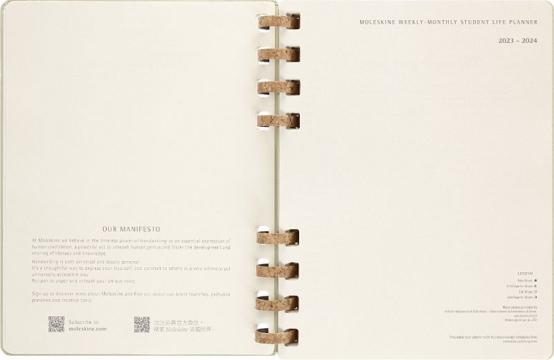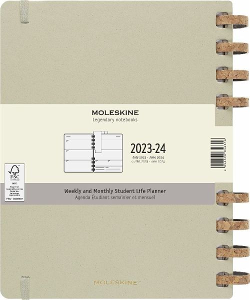 Eigenschaften - fester Einband, abgerundete Ecken, Gummiband zum Verschließen und interne Falttasche - robuste, aber flexible Spiralbindung aus Kork-Mix - Vorsatzblatt mit in case of loss Label - datiert von Juli 2023 bis Juni 2024 - elfenbeinweißes Papier, 100 g/m², säurefrei - Jahreszahl mit Goldfolienprägung auf dem vorderen Einband Layout Wochen-Monatskalender Formate Large 13 × 21 cm - 5 × 8 X-Large 19 × 25 cm - 7 × 9 Einlagen - Sticker - 3 laminierte Lesezeichen