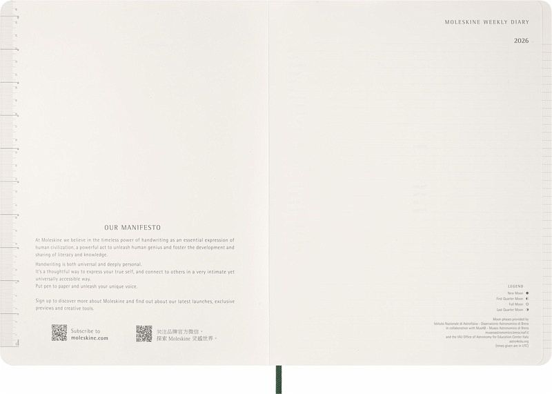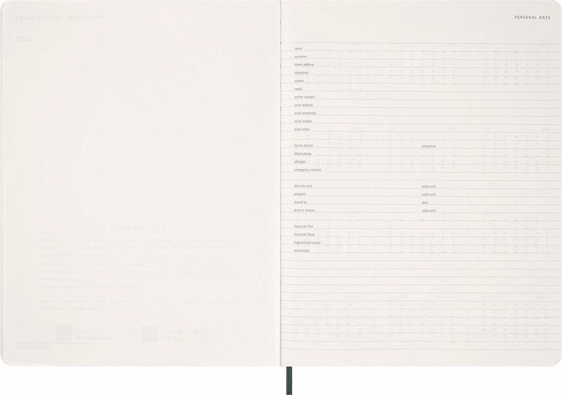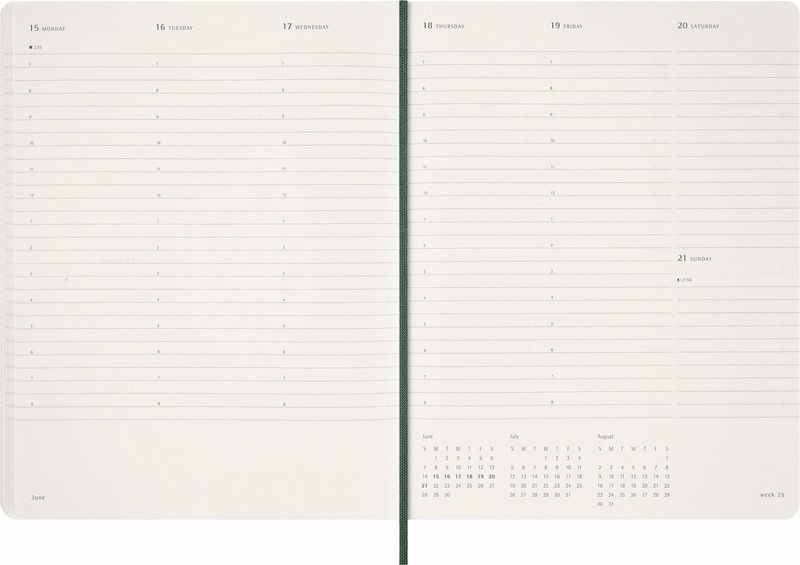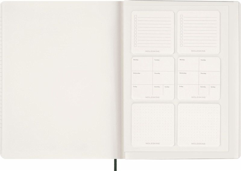 Ihr ultimativer Wochenbegleiter: Der XXL Essential Planner macht Organisation und Planung mühelos. Dieser schlanke und elegante Planer im unverwechselbaren Moleskine-Design hat einen flexiblen und dennoch robusten Einband. Im Inneren ist jede Woche auf zwei Seiten dargestellt. Die Wochentage werden vertikal angezeigt, mit stündlichen Feldern für Ihre Termine von 7 bis 20 Uhr, außer Samstag und Sonntag, die ohne Zeitangabe sind. Jede Woche enthält außerdem einen kleinen 3-Monats-Kalender, um Ihrer Planung eine gewisse Perspektive zu geben. Dieser Terminkalender ist so konzipiert, dass er den Bedürfnissen aller gerecht wird, von Pädagogen und Studenten bis hin zu Berufstätigen und Familien. Er deckt 15 Monate von Oktober 2025 bis Ende Januar 2026 ab und bietet so zusätzliche Flexibilität. Wir haben viele Aufkleber und eine Auswahl an Haftnotizen in die hintere Tasche eingesteckt, um Termine hervorzuheben und Ihre Pläne zu personalisieren. Ein diskretes Lesezeichenband markiert Ihren Platz, während der elastische Verschluss für Privatsphäre sorgt und alle losen Notizen sicher im Inneren verstaut. Wie alle unsere Planer beginnt auch der Essential Planner mit einer Seite für persönliche Daten und einer Übersicht über das laufende und das kommende Jahr, um den Überblick zu behalten. Am Ende des Plans gibt es außerdem freie Seiten für zufällige Notizen und Gedanken.
