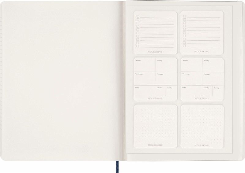 Ihr ultimativer Wochenbegleiter: Der XXL Essential Planner macht Organisation und Planung mühelos. Dieser schlanke und elegante Planer im unverwechselbaren Moleskine-Design hat einen flexiblen und dennoch robusten Einband. Im Inneren ist jede Woche auf zwei Seiten dargestellt. Die Wochentage werden vertikal angezeigt, mit stündlichen Feldern für Ihre Termine von 7 bis 20 Uhr, außer Samstag und Sonntag, die ohne Zeitangabe sind. Jede Woche enthält außerdem einen kleinen 3-Monats-Kalender, um Ihrer Planung eine gewisse Perspektive zu geben. Dieser Terminkalender ist so konzipiert, dass er den Bedürfnissen aller gerecht wird, von Pädagogen und Studenten bis hin zu Berufstätigen und Familien. Er deckt 15 Monate von Oktober 2025 bis Ende Januar 2026 ab und bietet so zusätzliche Flexibilität. Wir haben viele Aufkleber und eine Auswahl an Haftnotizen in die hintere Tasche eingesteckt, um Termine hervorzuheben und Ihre Pläne zu personalisieren. Ein diskretes Lesezeichenband markiert Ihren Platz, während der elastische Verschluss für Privatsphäre sorgt und alle losen Notizen sicher im Inneren verstaut. Wie alle unsere Planer beginnt auch der Essential Planner mit einer Seite für persönliche Daten und einer Übersicht über das laufende und das kommende Jahr, um den Überblick zu behalten. Am Ende des Plans gibt es außerdem freie Seiten für zufällige Notizen und Gedanken.