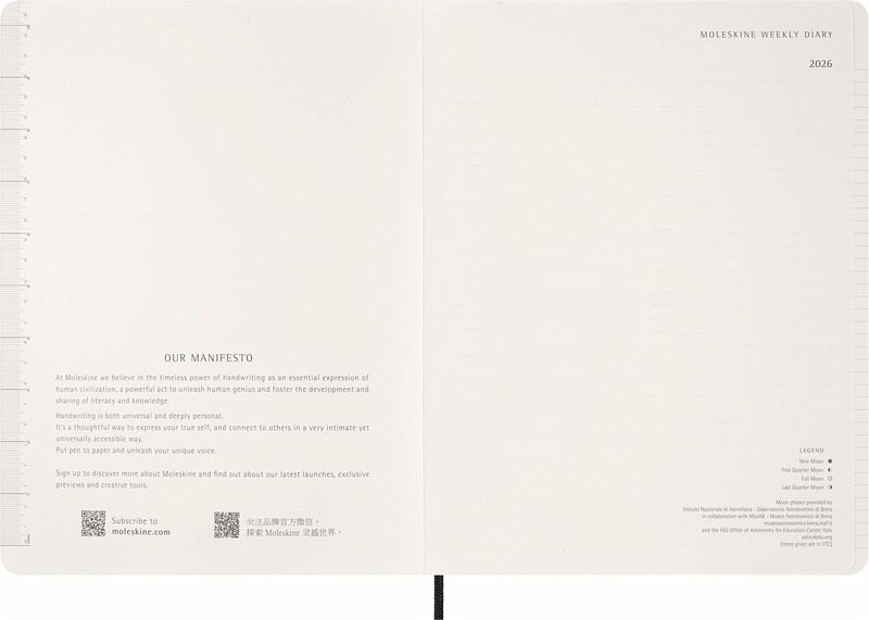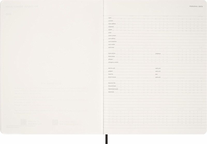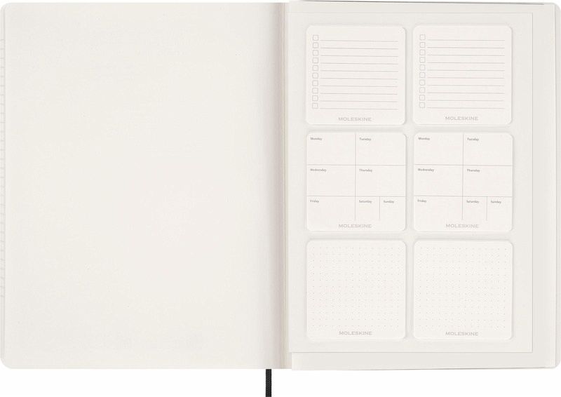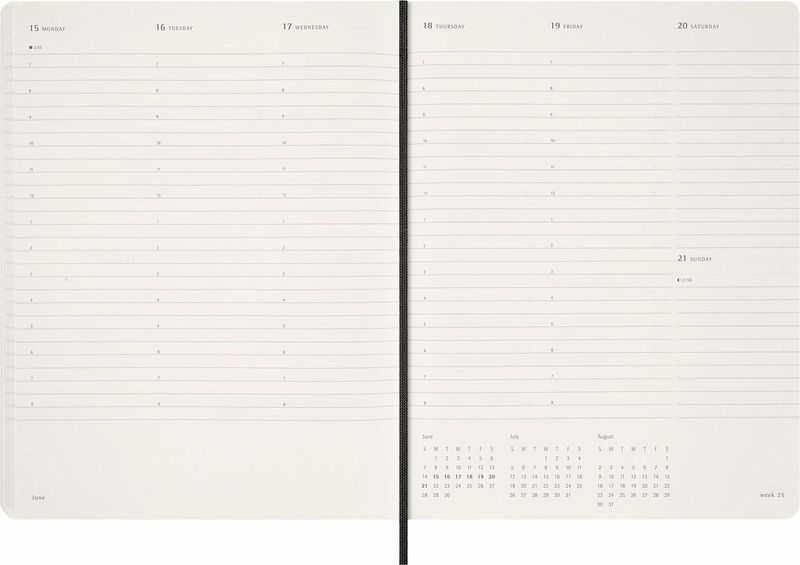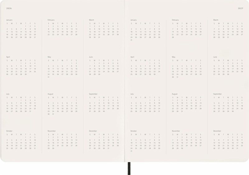 Ihr ultimativer Wochenbegleiter: Der XXL Essential Planner macht Organisation und Planung mühelos. Dieser schlanke und elegante Planer im unverwechselbaren Moleskine-Design hat einen flexiblen und dennoch robusten Einband. Im Inneren ist jede Woche auf zwei Seiten dargestellt. Die Wochentage werden vertikal angezeigt, mit stündlichen Feldern für Ihre Termine von 7 bis 20 Uhr, außer Samstag und Sonntag, die ohne Zeitangabe sind. Jede Woche enthält außerdem einen kleinen 3-Monats-Kalender, um Ihrer Planung eine gewisse Perspektive zu geben. Dieser Terminkalender ist so konzipiert, dass er den Bedürfnissen aller gerecht wird, von Pädagogen und Studenten bis hin zu Berufstätigen und Familien. Er deckt 15 Monate von Oktober 2025 bis Ende Januar 2026 ab und bietet so zusätzliche Flexibilität. Wir haben viele Aufkleber und eine Auswahl an Haftnotizen in die hintere Tasche eingesteckt, um Termine hervorzuheben und Ihre Pläne zu personalisieren. Ein diskretes Lesezeichenband markiert Ihren Platz, während der elastische Verschluss für Privatsphäre sorgt und alle losen Notizen sicher im Inneren verstaut. Wie alle unsere Planer beginnt auch der Essential Planner mit einer Seite für persönliche Daten und einer Übersicht über das laufende und das kommende Jahr, um den Überblick zu behalten. Am Ende des Plans gibt es außerdem freie Seiten für zufällige Notizen und Gedanken.