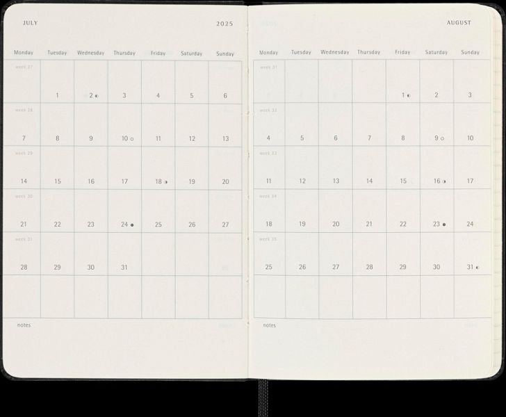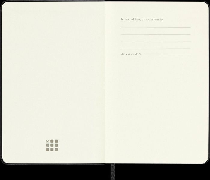 The Moleskine Weekly Notebook is dated from January to December. Formatted to show the week's appointments on the left and a ruled page for notes and ideas on the right, it is a handy and versatile planner that incorporates the freedom of a notebook. - Dated from January to December 2025 - Black hard cover - Rounded corners, elastic closure and matching ribbon bookmark - Ivory-colored, 70 g/m², acid-free paper - Useful tools: calendar, travel planning, ideas and goals, ruled pages for notes - Stickers to customize your plans and year stickers for the spine - Color-coordinated expandable inner pocket - 'In case of loss' notice printed on the flyleaf - Lies flat, opens at 180° - Dimensions, 3.5" x 5.5" - The paper of this Moleskine object is made of material from well-managed, FSC®-certified forests and other controlled sources.
