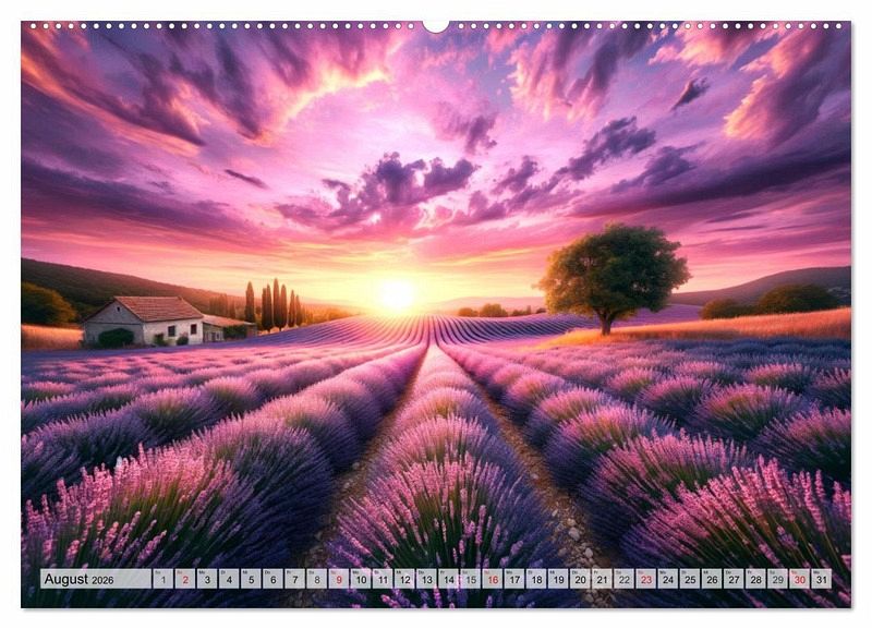 August: Ruhiges Lavendelfeld bei Sonnenuntergang