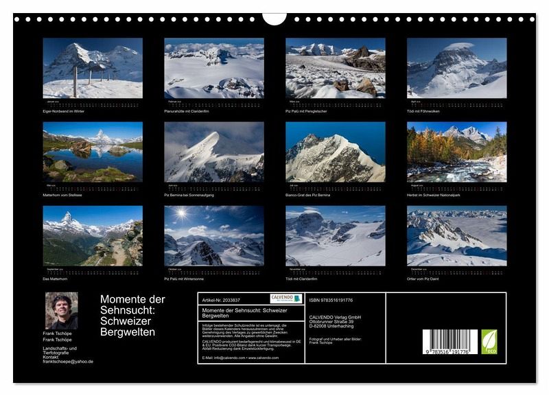 QUALITÄT - Hochwertiger Fotokalender mit 12 wunderschönen Motiven auf lichtbeständigem Bilderdruckpapier, robuste Spiralbindung mit Aufhängebügel.NACHHALTIG - deutliche Abfallreduzierung durch bedarfsgerechte Einzelstückfertigung, umweltfreundliches FSC-zertifiziertes Papier, Produktion in Deutschland, klimabewusste Logistik.PERFEKTES GESCHENK - Kalender für Freunde und Familie, für Kinder und Erwachsene, jung und alt, zu Weihnachten, Geburtstag oder zwischendurch.VIELFALT - Bildkalender in verschiedenen Formaten, z.B. DIN A5, DIN A4, DIN A3 sowie DIN A2. Ob Naturmotiv, Gemälde oder Fotos, ideal für ein persönliches Wohlfühlambiente.Berühmte Berge der Schweiz von Autor(in): Frank Tschöpe
