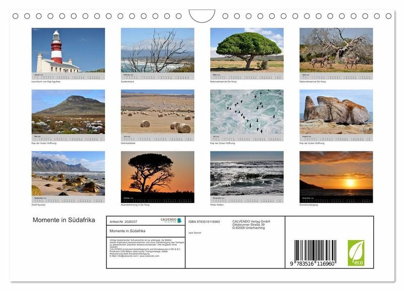 Genießen Sie Monat für Monat einen stimmungsvollen Moment aus Südafrika. Lauschen Sie dem Rauschen der Wellen, den Lauten der Wildtiere und träumen Sie im Sonnenuntergang. Jenseites der Weltmetropole Kapstadt entlang der Küste hinein in das Naturereservat De Hoop zeigen die Bilder die wunderbare Fauna und Flora von Südafrika.