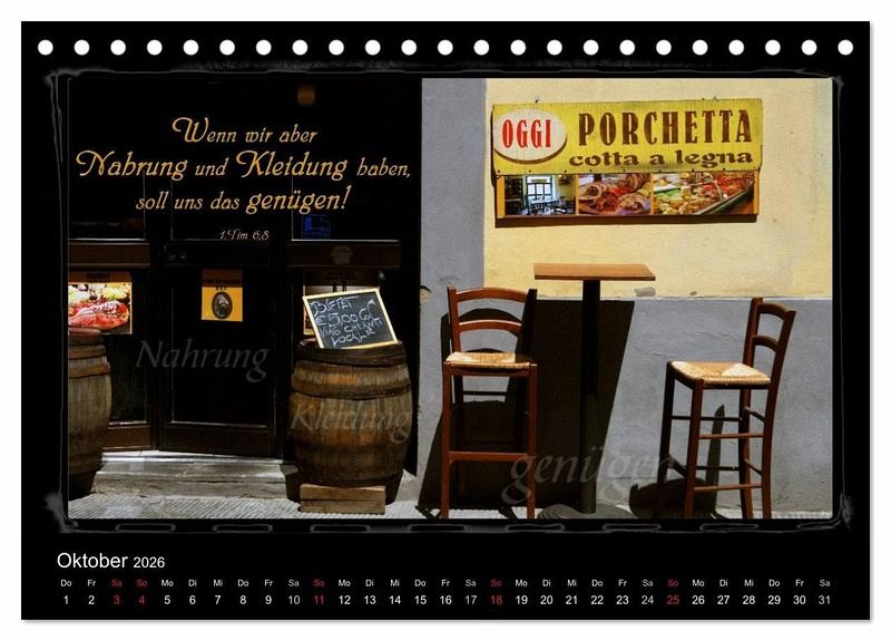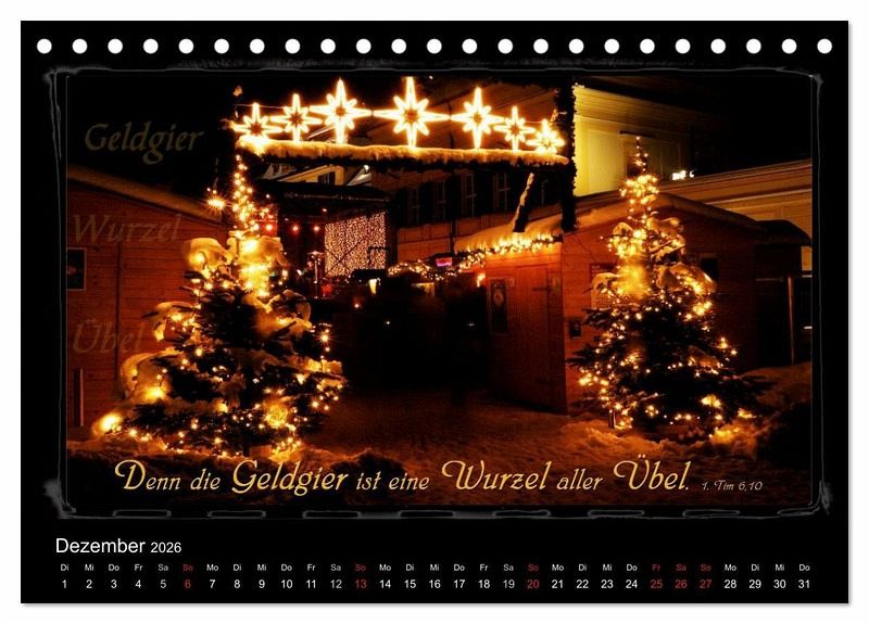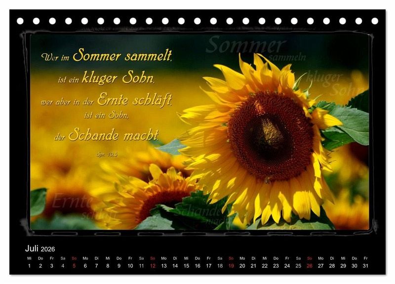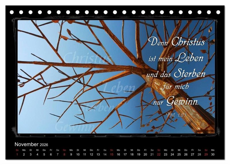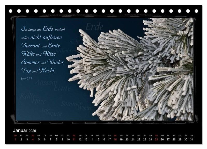 Dieser Kalender begleitet Sie durch das ganze Jahr, mit behutsam ausgesuchten Bibelversen, die mit geschmackvollen und teils künstlerischen Fotografien abgestimmt sind. Wenn Sie die Bibelverse aufmerksam beherzigen, kann das Ihr Leben positiv verändern. Der Kalender lädt den Betrachter ein, für eine Weile innezuhalten.