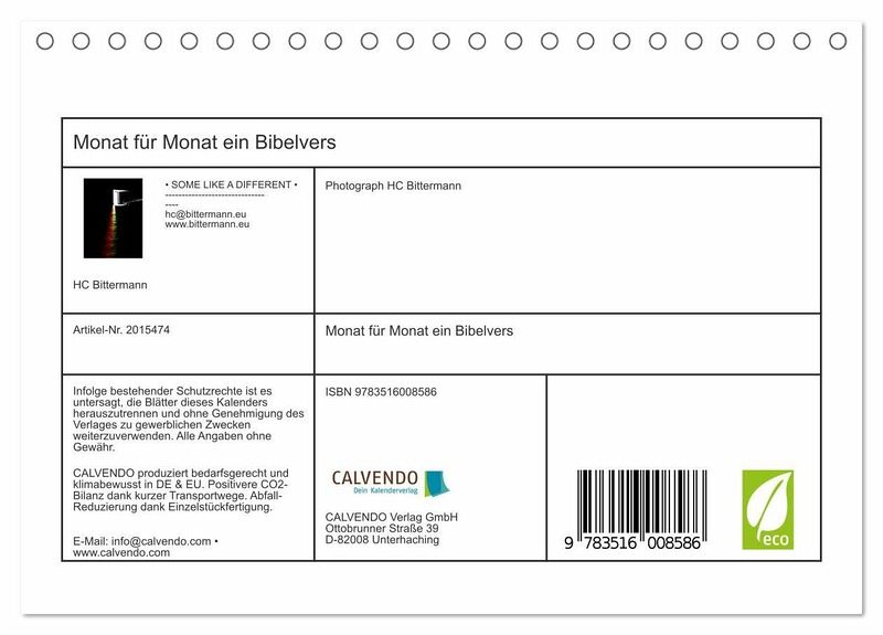 QUALITÄT - Hochwertiger Fotokalender mit 12 wunderschönen Motiven auf lichtbeständigem Bilderdruckpapier, robuste Spiralbindung.NACHHALTIG - deutliche Abfallreduzierung durch bedarfsgerechte Einzelstückfertigung, umweltfreundliches FSC-zertifiziertes Papier, Produktion in Deutschland, klimabewusste Logistik.PERFEKTES GESCHENK - Kalender für Freunde und Familie, für Kinder und Erwachsene, jung und alt, zu Weihnachten, Geburtstag oder zwischendurch.VIELFALT - Bildkalender in verschiedenen Formaten, z.B. DIN A5, DIN A4, DIN A3 sowie DIN A2. Ob Naturmotiv, Gemälde oder Fotos, ideal für ein persönliches Wohlfühlambiente.Mit behutsam ausgesuchten Bibelversen und wunderbaren Fotografien von Fotograf HC Bittermann ist dieser Kalender ein wertvoller Lebensberater durchs Jahr - er kann Ihr Leben positiv beeinflussen! von Autor(in): Photograph HC Bittermann