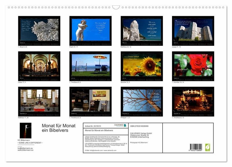 QUALITÄT - Hochwertiger Fotokalender mit 12 wunderschönen Motiven auf lichtbeständigem Bilderdruckpapier, robuste Spiralbindung mit Aufhängebügel.NACHHALTIG - deutliche Abfallreduzierung durch bedarfsgerechte Einzelstückfertigung, umweltfreundliches FSC-zertifiziertes Papier, Produktion in Deutschland, klimabewusste Logistik.PERFEKTES GESCHENK - Kalender für Freunde und Familie, für Kinder und Erwachsene, jung und alt, zu Weihnachten, Geburtstag oder zwischendurch.VIELFALT - Bildkalender in verschiedenen Formaten, z.B. DIN A5, DIN A4, DIN A3 sowie DIN A2. Ob Naturmotiv, Gemälde oder Fotos, ideal für ein persönliches Wohlfühlambiente.Mit behutsam ausgesuchten Bibelversen und wunderbaren Fotografien von Fotograf HC Bittermann ist dieser Kalender ein wertvoller Lebensberater durchs Jahr - er kann Ihr Leben positiv beeinflussen! von Autor(in): Photograph HC Bittermann