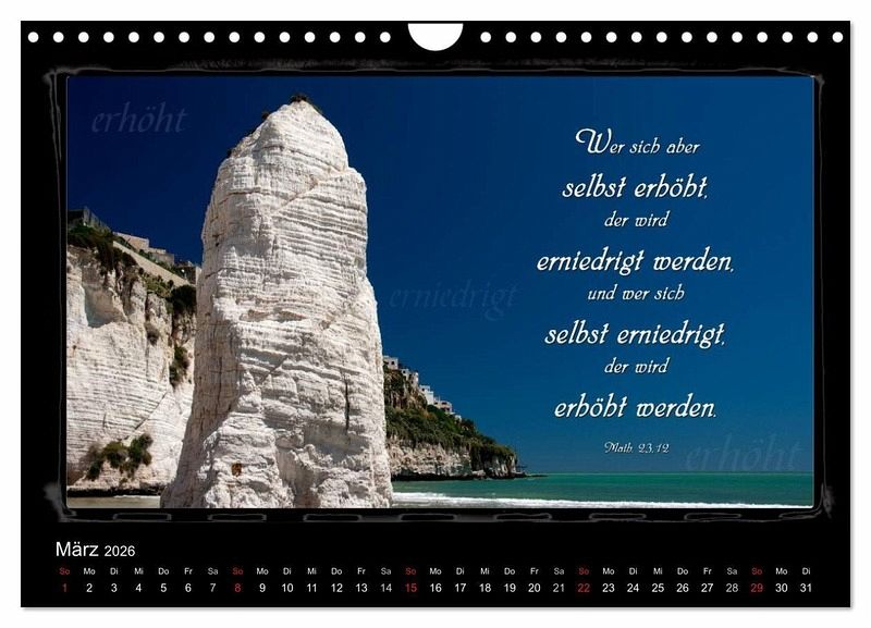 Dieser Kalender begleitet Sie durch das ganze Jahr, mit behutsam ausgesuchten Bibelversen, die mit geschmackvollen und teils künstlerischen Fotografien abgestimmt sind. Wenn Sie die Bibelverse aufmerksam beherzigen, kann das Ihr Leben positiv verändern. Der Kalender lädt den Betrachter ein, für eine Weile innezuhalten.