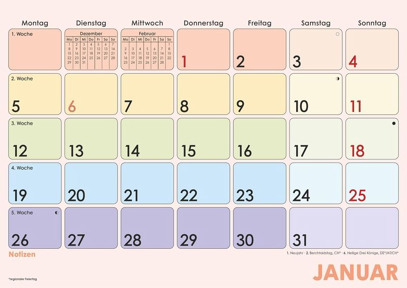 Der Monatsplaner Farbenfroh 2026 von Alpha Edition bietet eine übersichtliche und klare Struktur, ideal für Büro, Homeoffice oder Familienorganisation. Mit einem Monat pro Seite behalten Sie wichtige Termine und Fristen stets im Blick. Die Sonn- und Feiertage sind farblich hervorgehoben, und die praktische Übersicht über Vor- und Folgemonat erleichtert die Planung.