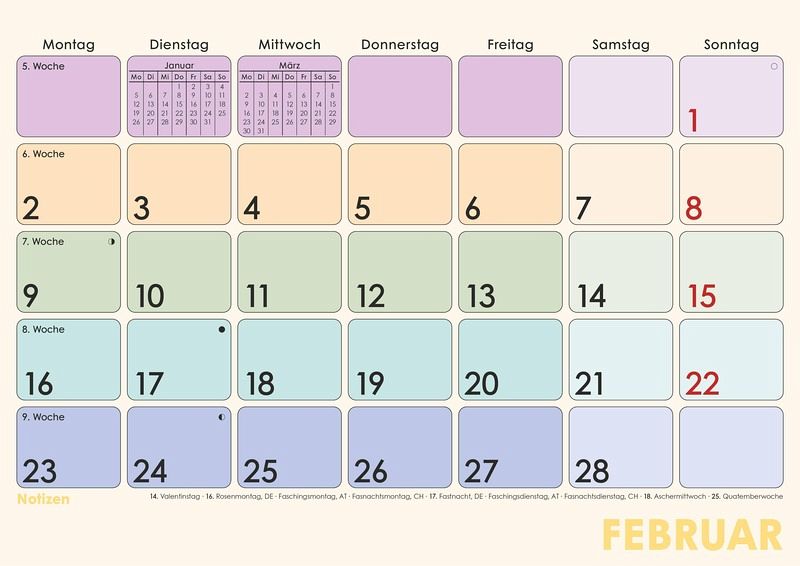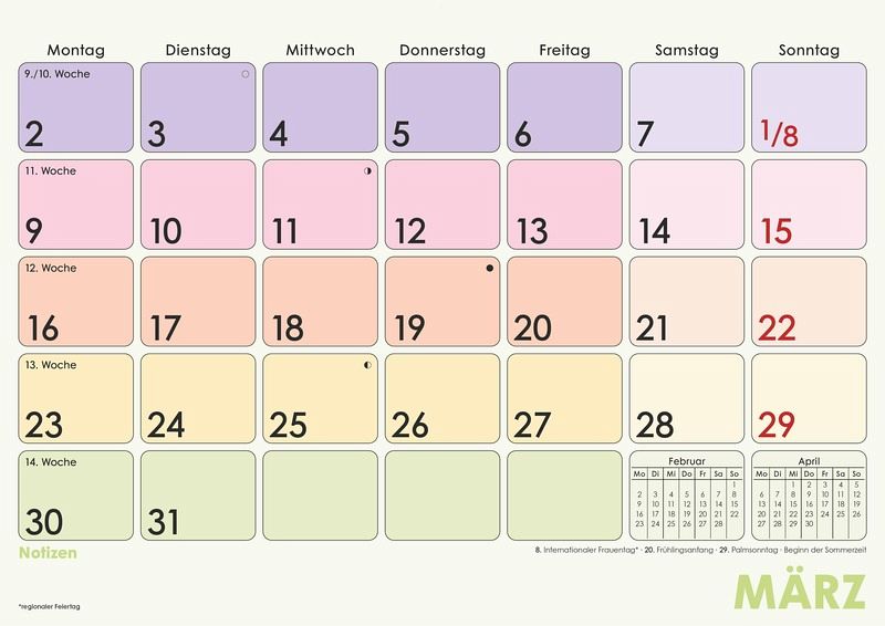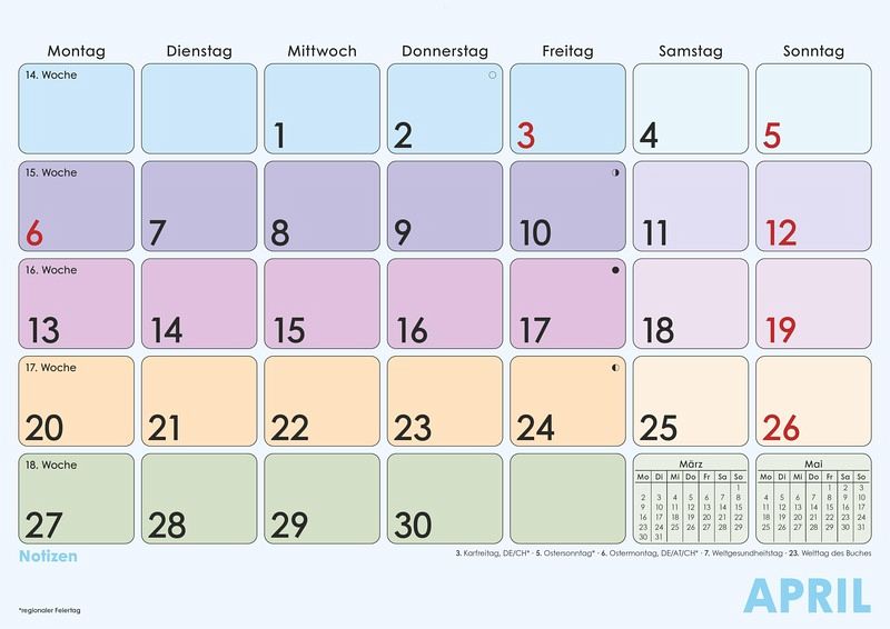 Praktische Monatsübersicht: 1 Monat/1 Blatt für klare Struktur DIN A4-Format: 29,7 × 21 cm ideal für Wand, Kühlschrank oder Schreibtisch Farblich hervorgehobene Sonn- & Feiertage für schnelle Orientierung Mit Wochenzählung perfekt für Projektplanung und Terminabstimmungen 16 Blatt, Drahtkammbindung mit Aufhänger für einfaches Umblättern Kalendarium in Deutsch mit Übersicht über Vor- und Folgemonat Schwarz-blauer Druck für klare Lesbarkeit