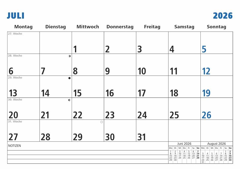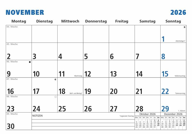 Kalendertyp: Monatsterminkalender (1M/1S) Übersichtliches Kalendarium: 1 Monat pro Blatt, Sonn- und Feiertage hervorgehoben Zusatzinformationen: Mit Wochenzählung sowie Übersicht über Vormonat und Folgemonat Praktische Details: 16 Blatt, stabile Drahtkammbindung, mit Aufhänger Design: Druck in Schwarz/Blau, klare Gliederung, Kalendarium deutsch Format & Ausstattung: 30 × 21 cm (A4)