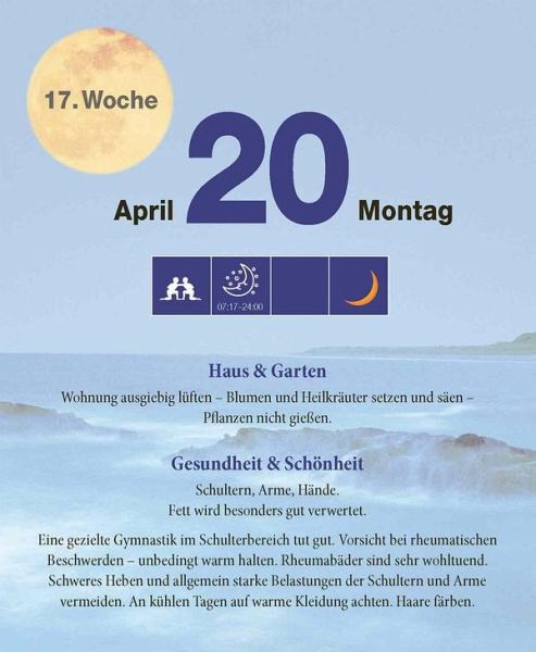 Der Kalender für die praktische Tagesplanung im Zeichen des Mondes. Mit ausführlichen Informationen zu Haushalt, Garten, Gesundheit und Schönheit.