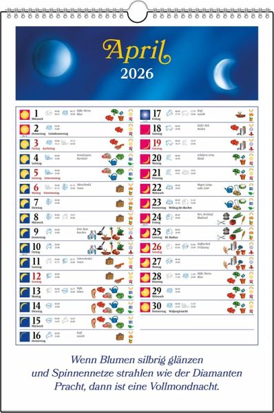 Sie möchten Ihr Leben optimieren, indem Sie bewusster auf die Rhythmen der Natur achten? Dieser attraktive, großformatige Wandkalender ist seit einem guten Vierteljahrhundert geradezu der Leuchtturm, wenn man den richtigen Weg sucht, die wichtigsten Mondeinflüsse zu verstehen. Er bietet auf seinen klar gestalteten Monatsseiten grundlegende Informationen zu den Mondphasen und Mondständen sowie Tipps für die Bereiche Gesundheit, Körperpflege, Garten, Landwirtschaft, Reisen, Geld und zwischenmenschliche Harmonie.