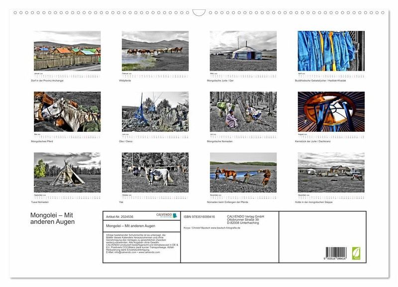 QUALITÄT - Hochwertiger Fotokalender mit 12 wunderschönen Motiven auf lichtbeständigem Bilderdruckpapier, robuste Spiralbindung mit Aufhängebügel.NACHHALTIG - deutliche Abfallreduzierung durch bedarfsgerechte Einzelstückfertigung, umweltfreundliches FSC-zertifiziertes Papier, Produktion in Deutschland, klimabewusste Logistik.PERFEKTES GESCHENK - Kalender für Freunde und Familie, für Kinder und Erwachsene, jung und alt, zu Weihnachten, Geburtstag oder zwischendurch.VIELFALT - Bildkalender in verschiedenen Formaten, z.B. DIN A5, DIN A4, DIN A3 sowie DIN A2. Ob Naturmotiv, Gemälde oder Fotos, ideal für ein persönliches Wohlfühlambiente.Die Mongolei in Schwarz-Weiß-Bildern mit Farbe von Autor(in): Christof Bautsch
