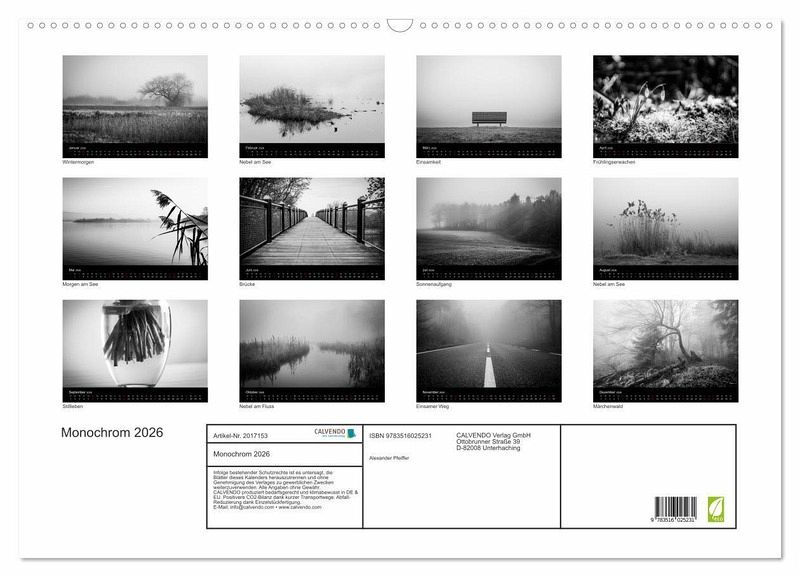 QUALITÄT - Hochwertiger Fotokalender mit 12 wunderschönen Motiven auf lichtbeständigem Bilderdruckpapier, robuste Spiralbindung mit Aufhängebügel.NACHHALTIG - deutliche Abfallreduzierung durch bedarfsgerechte Einzelstückfertigung, umweltfreundliches FSC-zertifiziertes Papier, Produktion in Deutschland, klimabewusste Logistik.PERFEKTES GESCHENK - Kalender für Freunde und Familie, für Kinder und Erwachsene, jung und alt, zu Weihnachten, Geburtstag oder zwischendurch.VIELFALT - Bildkalender in verschiedenen Formaten, z.B. DIN A5, DIN A4, DIN A3 sowie DIN A2. Ob Naturmotiv, Gemälde oder Fotos, ideal für ein persönliches Wohlfühlambiente.Monatskalender mit stimmungsvollen Bildern in schwarz-weiß von Autor(in): Alexander Pfeiffer