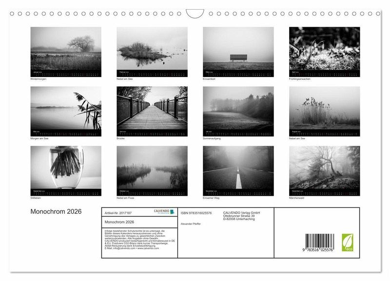 QUALITÄT - Hochwertiger Fotokalender mit 12 wunderschönen Motiven auf lichtbeständigem Bilderdruckpapier, robuste Spiralbindung mit Aufhängebügel.NACHHALTIG - deutliche Abfallreduzierung durch bedarfsgerechte Einzelstückfertigung, umweltfreundliches FSC-zertifiziertes Papier, Produktion in Deutschland, klimabewusste Logistik.PERFEKTES GESCHENK - Kalender für Freunde und Familie, für Kinder und Erwachsene, jung und alt, zu Weihnachten, Geburtstag oder zwischendurch.VIELFALT - Bildkalender in verschiedenen Formaten, z.B. DIN A5, DIN A4, DIN A3 sowie DIN A2. Ob Naturmotiv, Gemälde oder Fotos, ideal für ein persönliches Wohlfühlambiente.Monatskalender mit stimmungsvollen Bildern in schwarz-weiß von Autor(in): Alexander Pfeiffer