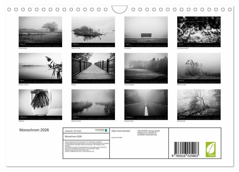 QUALITÄT - Hochwertiger Fotokalender mit 12 wunderschönen Motiven auf lichtbeständigem Bilderdruckpapier, robuste Spiralbindung mit Aufhängebügel.NACHHALTIG - deutliche Abfallreduzierung durch bedarfsgerechte Einzelstückfertigung, umweltfreundliches FSC-zertifiziertes Papier, Produktion in Deutschland, klimabewusste Logistik.PERFEKTES GESCHENK - Kalender für Freunde und Familie, für Kinder und Erwachsene, jung und alt, zu Weihnachten, Geburtstag oder zwischendurch.VIELFALT - Bildkalender in verschiedenen Formaten, z.B. DIN A5, DIN A4, DIN A3 sowie DIN A2. Ob Naturmotiv, Gemälde oder Fotos, ideal für ein persönliches Wohlfühlambiente.Monatskalender mit stimmungsvollen Bildern in schwarz-weiß von Autor(in): Alexander Pfeiffer