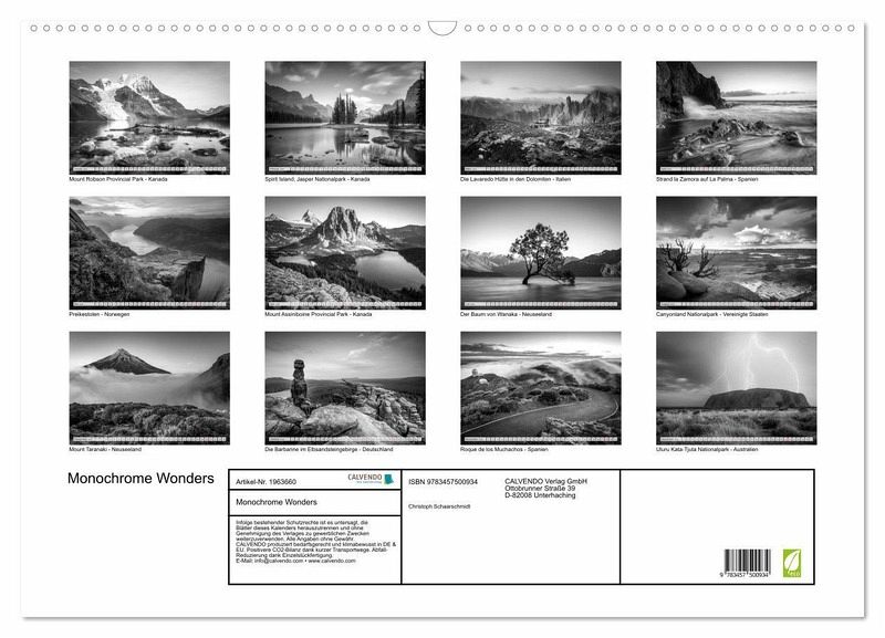 Fotograf Christoph Schaarschmidt nimmt Sie mit auf eine Reise zu den Wundern unserer Erde. Reisen Sie auf 12 Bildern von Europa nach Nordamerika und bis nach Australien und Neuseeland. Alle Bilder werden in kunsvollem Schwarz/Weiss präsentiert.