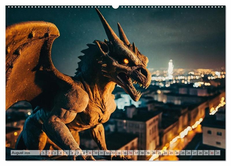 August: Ein lebendiger Gargoyle über den Dächern einer Großstadt