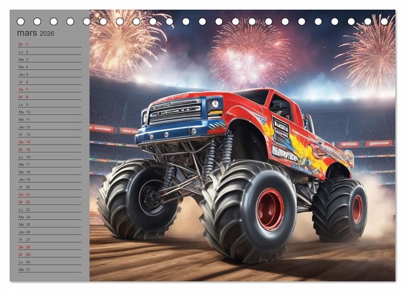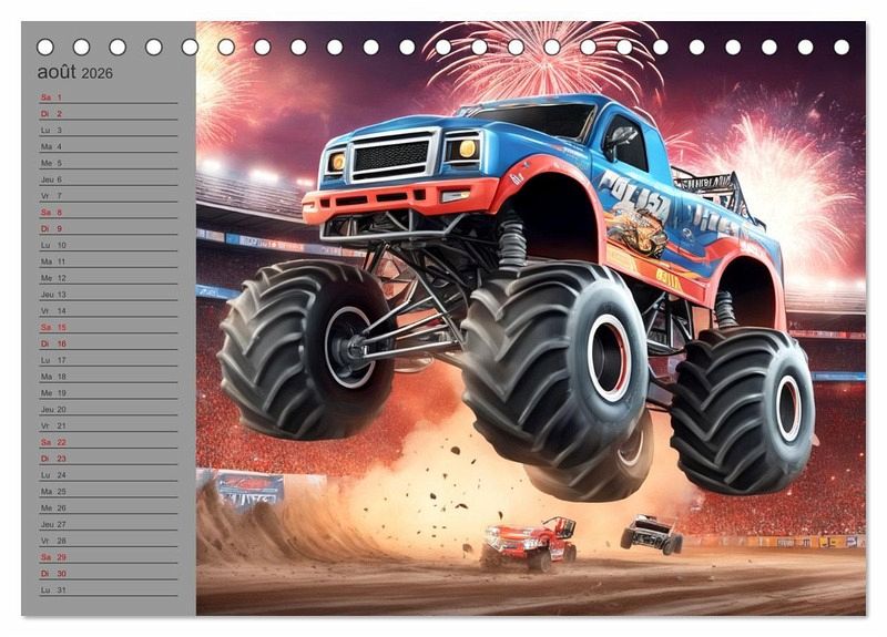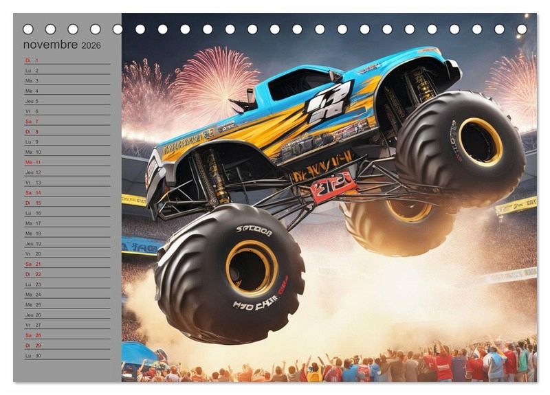 Les monster Trucks sont de gros véhicules puissants dotés de roues et de suspensions surdimensionnées. Ils sont généralement utilisés à des fins de divertissement, comme lors de spectacles et de compétitions. Ces événements mettent souvent en vedette des camions effectuant des cascades et écrasant des voitures. Les images de ce calendrier sont générées à l'aide de l'intelligence artificielle.