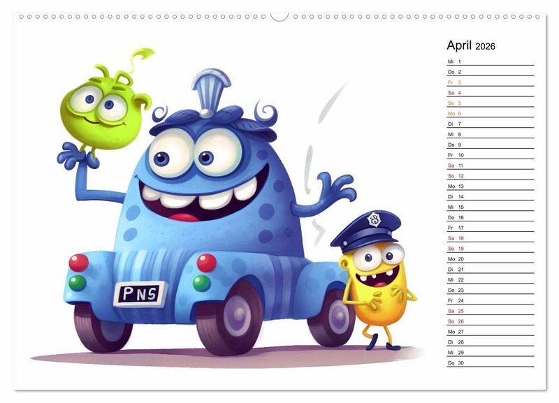 Entdecken Sie mit unserem Monster-Kinderkalender die aufregende Welt der Traumjobs! Jeden Monat üben die kleinen Monster neue Berufe aus, wie zum Beispiel Goldsucher, Feuerwehrmann oder Rennfahrer und vieles mehr. Der Kalender verfügt auch über eine praktische Planerfunktion, mit dem ihre Kinder alle seine Termine im Blick behält. Die KI-generierten Monster erstrahlen in lebendigen Farben.