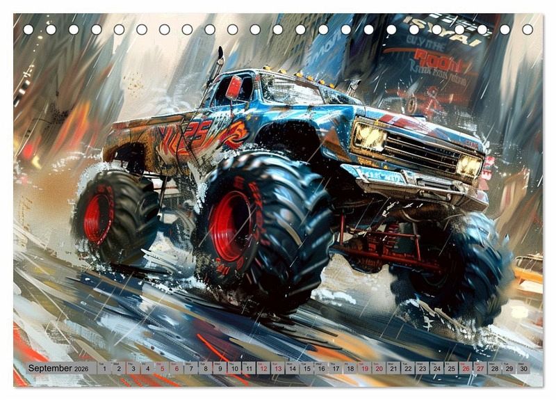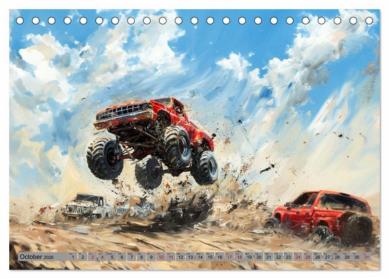 Rev up your excitement with the Monstertruck Madness: Powered by AI calendar. Experience the adrenaline rush of 12 jaw-dropping images, each showcasing the monstrous power and thrilling stunts of these titans of the track. With the magic of AI technology, every picture bursts to life, capturing the raw energy and excitement of monster truck madness. Get ready for a year of heart-pounding action and awe-inspiring feats, all in the palm of your hand.