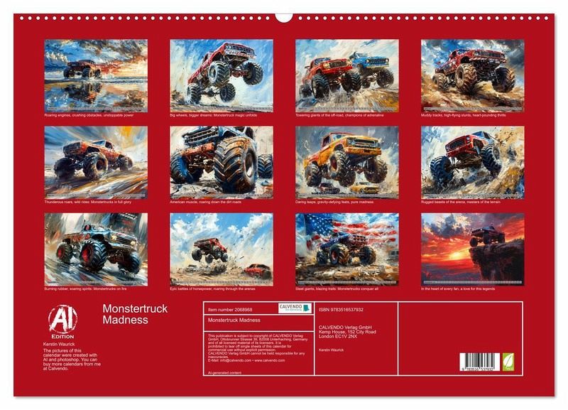QUALITY - High-quality photo calendar with 12 beautiful images on light-resistant paper, robust spiral binding with hanger.SUSTAINABLE - Significant waste reduction due to print-on-demand production, environmentally friendly FSC-certified paper, produced in the UK, climate-conscious logistical processes.PERFECT GIFT - calendars for friends and family, for children, all ages and all occasions, from Christmas to birthdays and everything in between.LOTS OF CHOICE - Wall calendars in different sizes (DIN A4 and DIN A3), for any topic and personal taste, featuring photography, painting and illustrations.Wild paintings of untamable off-road tucks, author: Kerstin Waurick