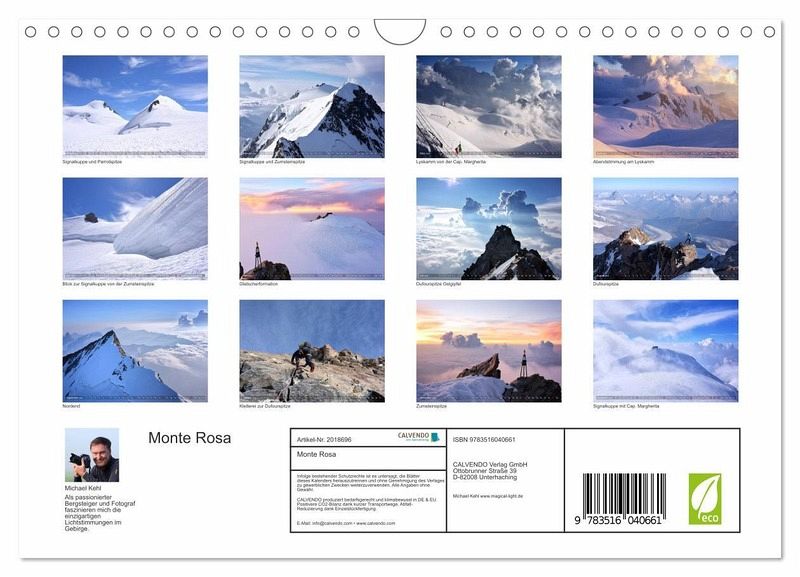 QUALITÄT - Hochwertiger Fotokalender mit 12 wunderschönen Motiven auf lichtbeständigem Bilderdruckpapier, robuste Spiralbindung mit Aufhängebügel.NACHHALTIG - deutliche Abfallreduzierung durch bedarfsgerechte Einzelstückfertigung, umweltfreundliches FSC-zertifiziertes Papier, Produktion in Deutschland, klimabewusste Logistik.PERFEKTES GESCHENK - Kalender für Freunde und Familie, für Kinder und Erwachsene, jung und alt, zu Weihnachten, Geburtstag oder zwischendurch.VIELFALT - Bildkalender in verschiedenen Formaten, z.B. DIN A5, DIN A4, DIN A3 sowie DIN A2. Ob Naturmotiv, Gemälde oder Fotos, ideal für ein persönliches Wohlfühlambiente.Das Monte Rosa Massiv in brillanten Aufnahmen. von Autor(in): Michael Kehl