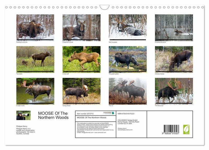 QUALITY - High-quality photo calendar with 12 beautiful images on light-resistant paper, robust spiral binding with hanger.SUSTAINABLE - Significant waste reduction due to print-on-demand production, environmentally friendly FSC-certified paper, produced in the UK, climate-conscious logistical processes.PERFECT GIFT - calendars for friends and family, for children, all ages and all occasions, from Christmas to birthdays and everything in between.LOTS OF CHOICE - Wall calendars in different sizes (DIN A4 and DIN A3), for any topic and personal taste, featuring photography, painting and illustrations.Let's follow the moose of Quebec northernwoods. Philippe Henry presents 13 photos of this silent giant., author: Philippe Henry