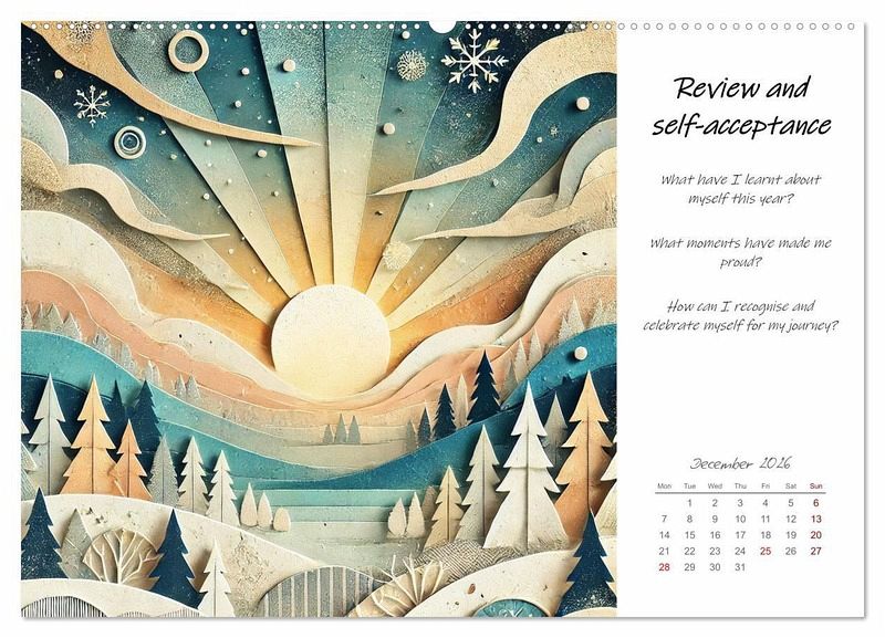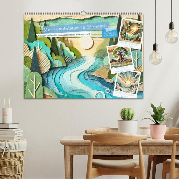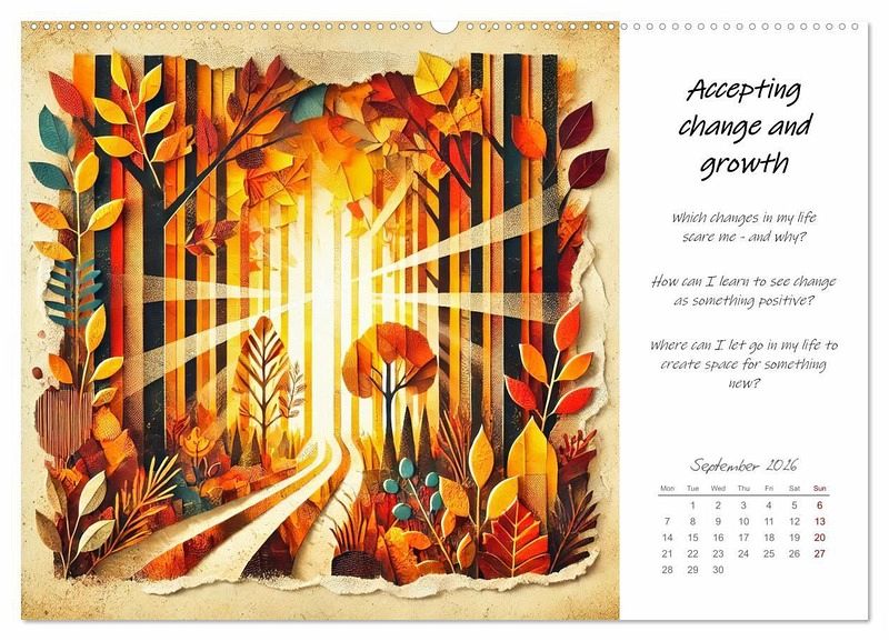 Are you ready to boost your self-confidence and go through the year more consciously. This unique reflection calendar accompanies you month by month with inspiring questions and artistic collages created with the help of artificial intelligence. Each monthly page shows a unique nature motif in a creative collage style. There are also reflection questions and impulses to help you strengthen your self-confidence and discover your personal growth path. The images and questions are based on the seasons and their symbolism for change, strength and new beginnings. Use the calendar as a daily reminder to trust yourself and live more consciously.
