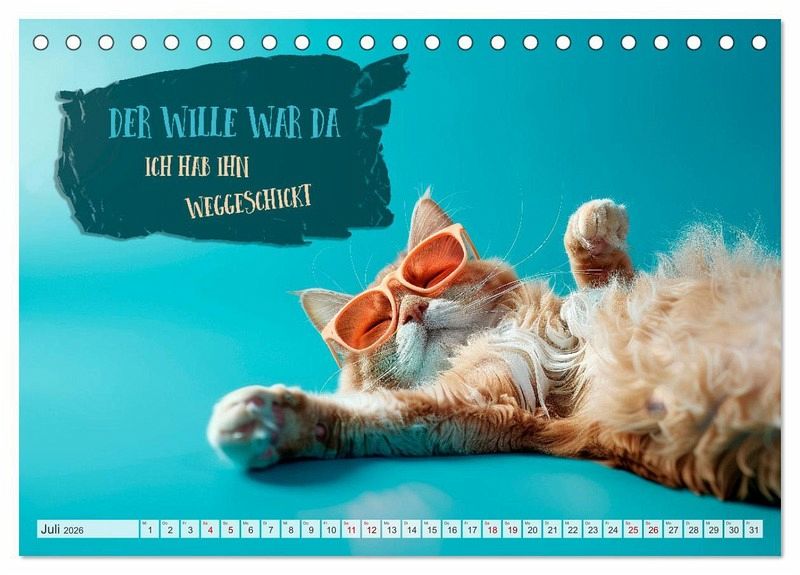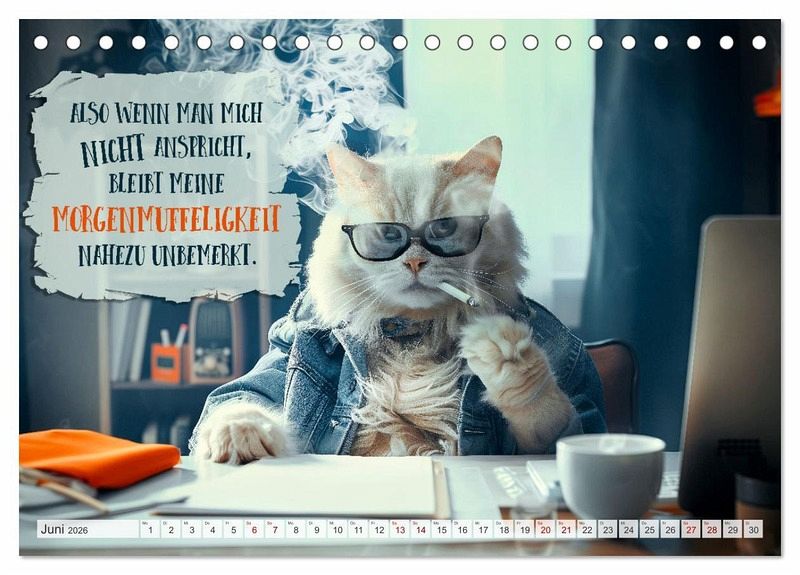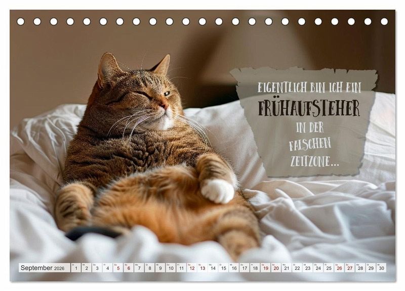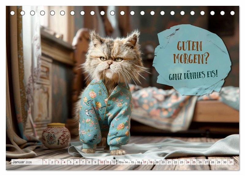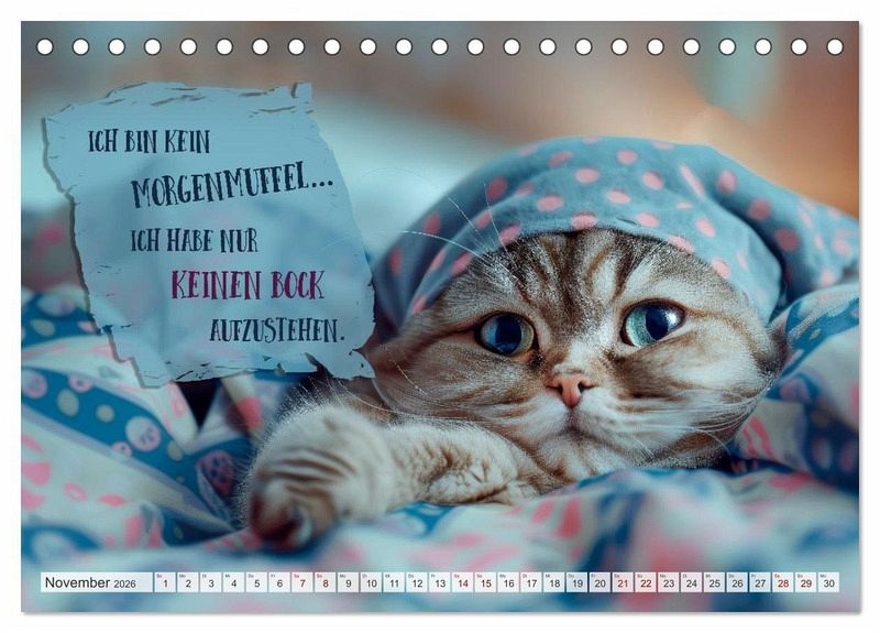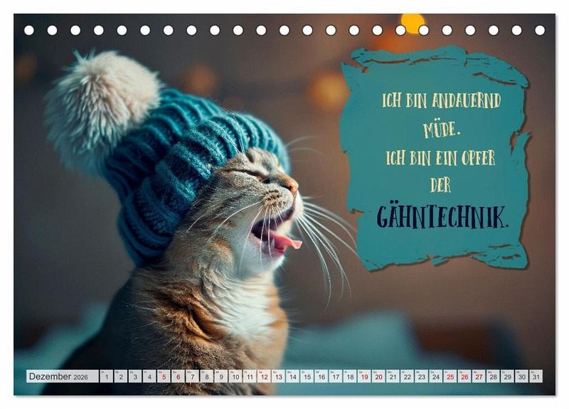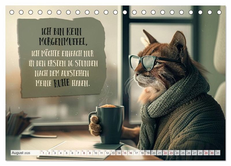 Der ultimative Kalender für Morgenmuffel und Katzenliebhaber. Jeden Monat erwarten dich freche Sprüche und witzige Weisheiten, präsentiert von den flauschigsten Experten in Sachen Schlafen. Perfekt, um selbst die härtesten Schlafmützen zum Schmunzeln zu bringen. Schnurrend gut auch vor dem ersten Kaffee. Die Motive wurden in Zusammenarbeit mit künstlicher Intelligenz und ohne Tierleid erschaffen.