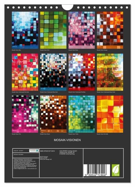 QUALITÄT - Hochwertiger Fotokalender mit 12 wunderschönen Motiven auf lichtbeständigem Bilderdruckpapier, robuste Spiralbindung mit Aufhängebügel.NACHHALTIG - deutliche Abfallreduzierung durch bedarfsgerechte Einzelstückfertigung, umweltfreundliches FSC-zertifiziertes Papier, Produktion in Deutschland, klimabewusste Logistik.PERFEKTES GESCHENK - Kalender für Freunde und Familie, für Kinder und Erwachsene, jung und alt, zu Weihnachten, Geburtstag oder zwischendurch.VIELFALT - Bildkalender in verschiedenen Formaten, z.B. DIN A5, DIN A4, DIN A3 sowie DIN A2. Ob Naturmotiv, Gemälde oder Fotos, ideal für ein persönliches Wohlfühlambiente.Abstrakte Mosaik-Motive in leuchtenden Farbkompositionen von Autor(in): ROTH-Design